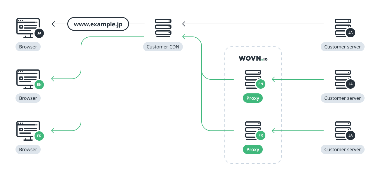 ブラウザとお客様の Web サーバーの間に WOVN Proxy サーバーを設置する方式です。
