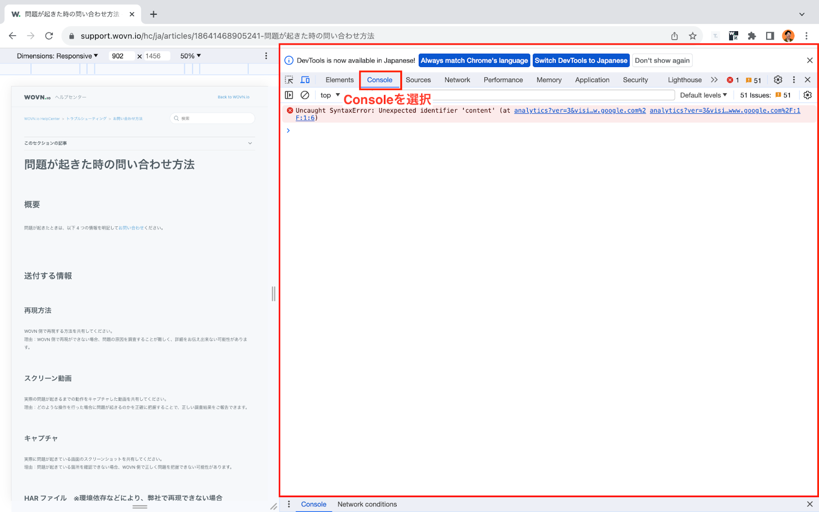 Console 画面のキャプチャを WOVN 側へ共有する(GoogleChrome)