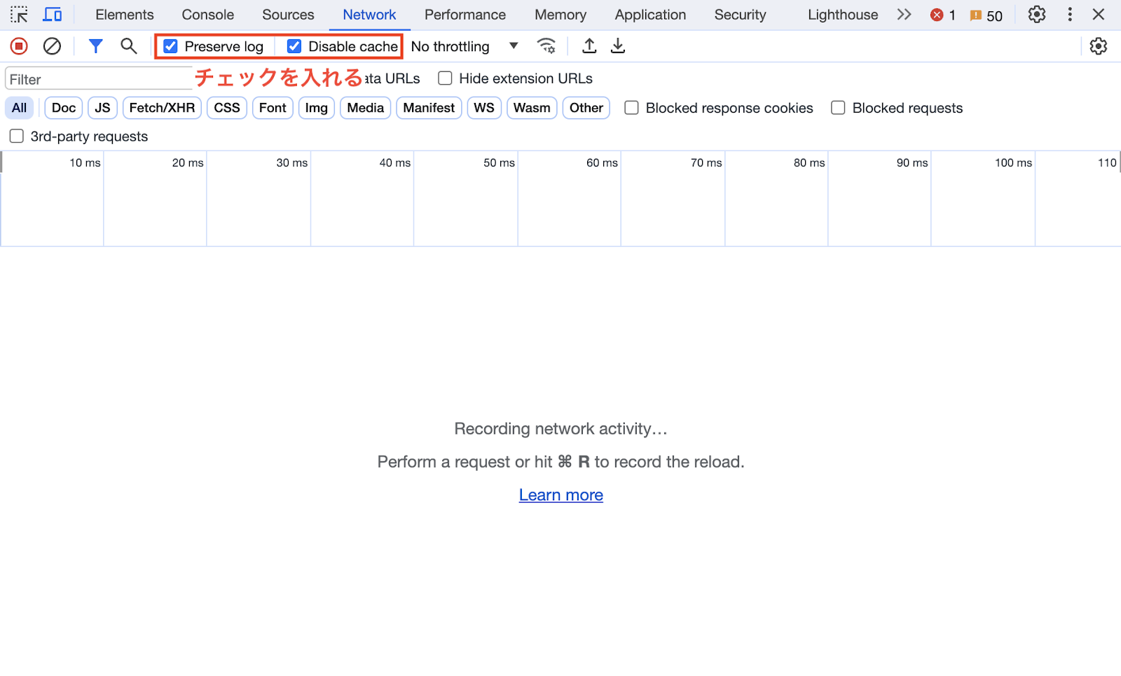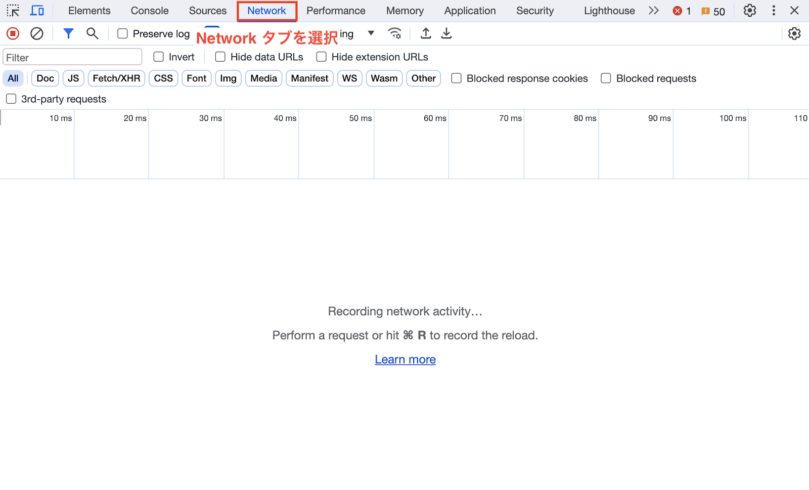 以下ボタンをクリックし、一度「Network」タブに表示されていたログを消去します。