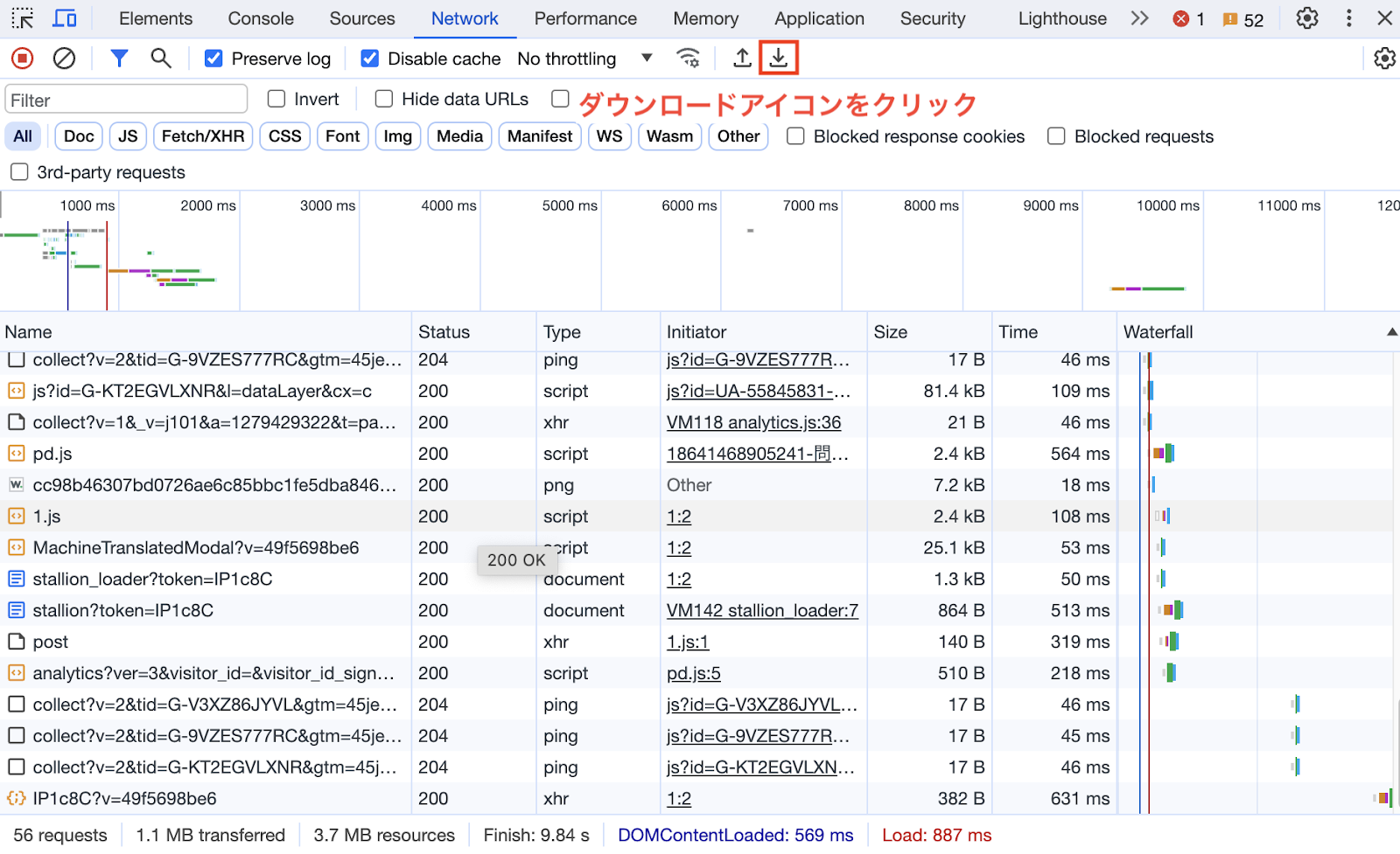 記録中に問題が発生することに成功したら、ダウンロードアイコン「Export HAR」をクリックすると、HAR ファイルが保存されます。