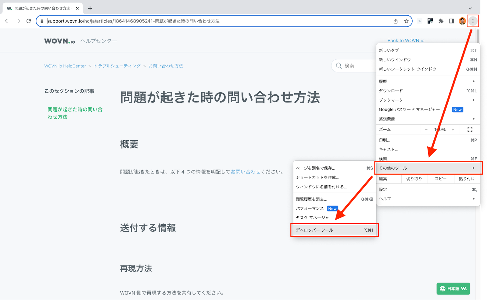 問題が起きたときは、以下 5 つの情報を明記し、WOVN 管理画面右上の「お問い合わせ」ボタンからお問い合わせください。