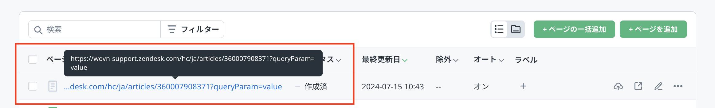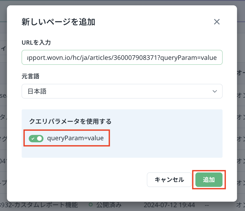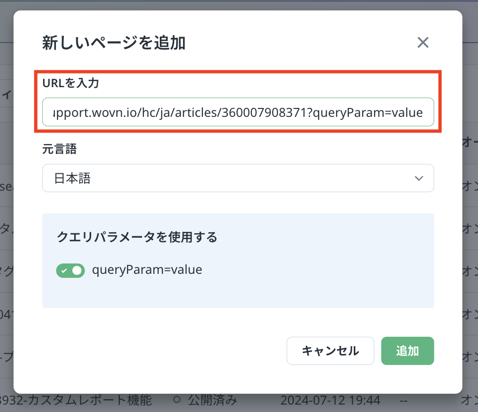 WOVN 管理画面にページを追加する際、 URL のクエリパラメーター以降の文字列は無視され、クエリパラメーターがついていない URL で登録されます。