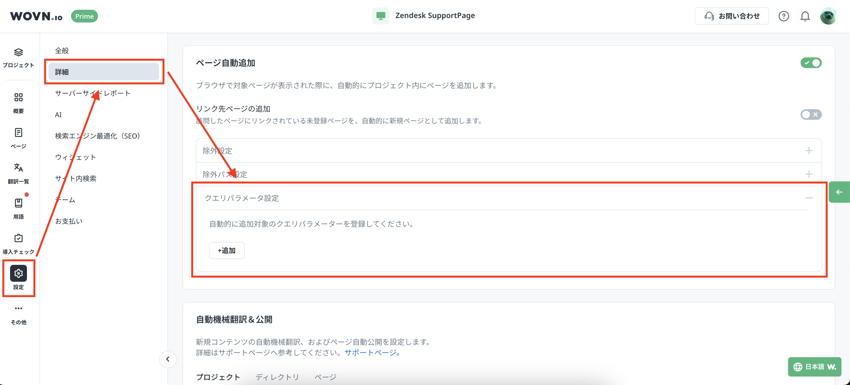 左側メニュー「設定」→「詳細」を押下し、「クエリパラメーター設定」に移動します。