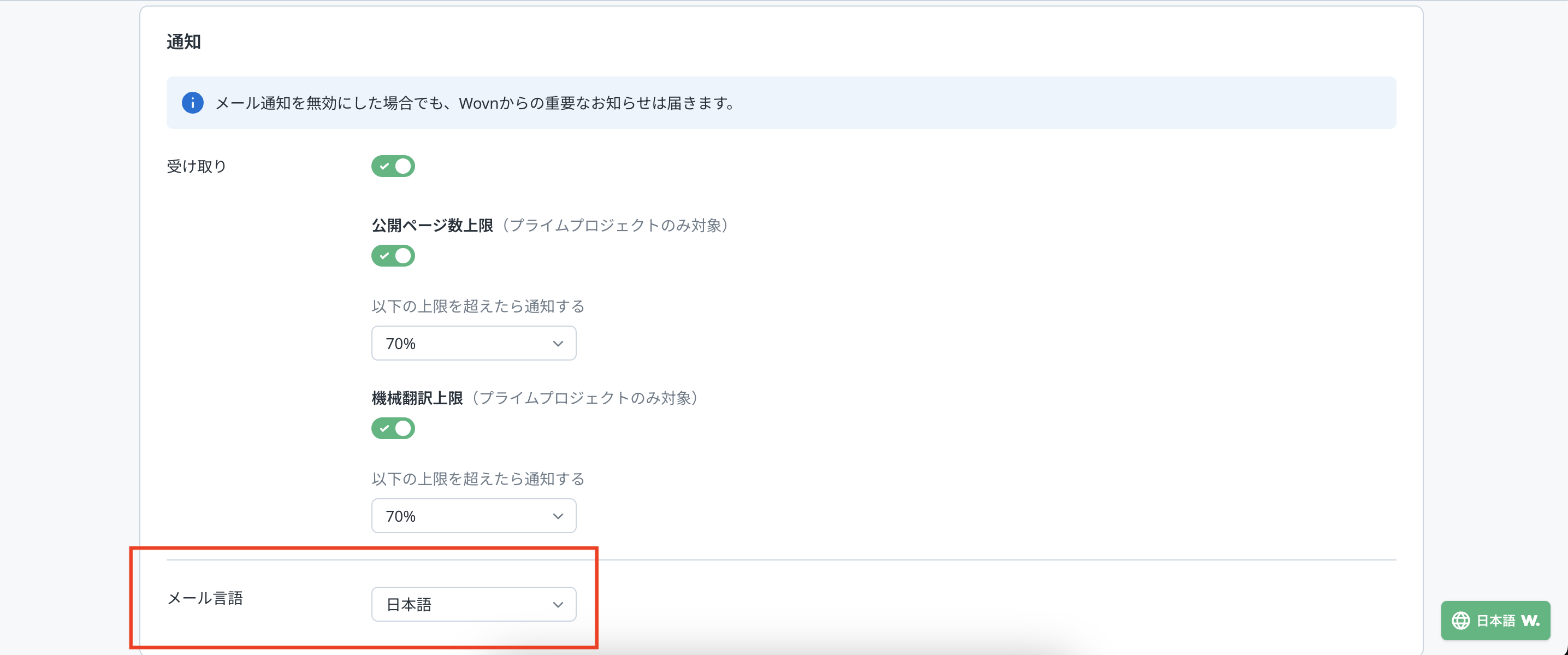 WOVN から送られてくるメールを日本語にするには? WOVN 管理画面にログイン後、右上の丸いアカウントアイコンを押下し、「アカウント」→「通知」→「メール言語」 から、「日本語」 を選択してください。