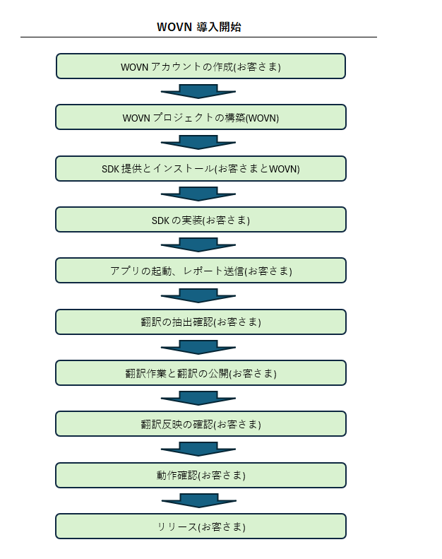 WOVN.app にて、モバイルアプリを多言語化するには、アプリ開発環境での作業と、WOVN 管理画面での作業が必要になります。