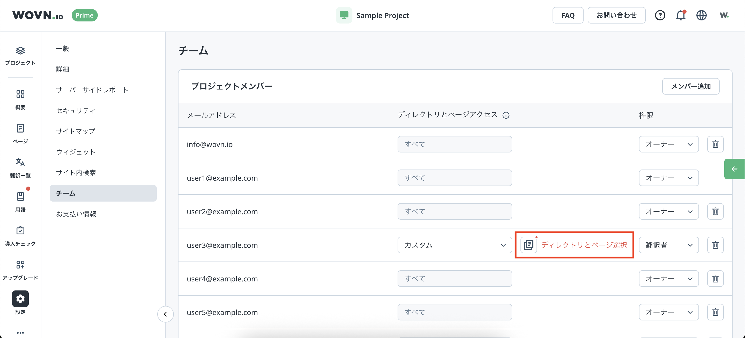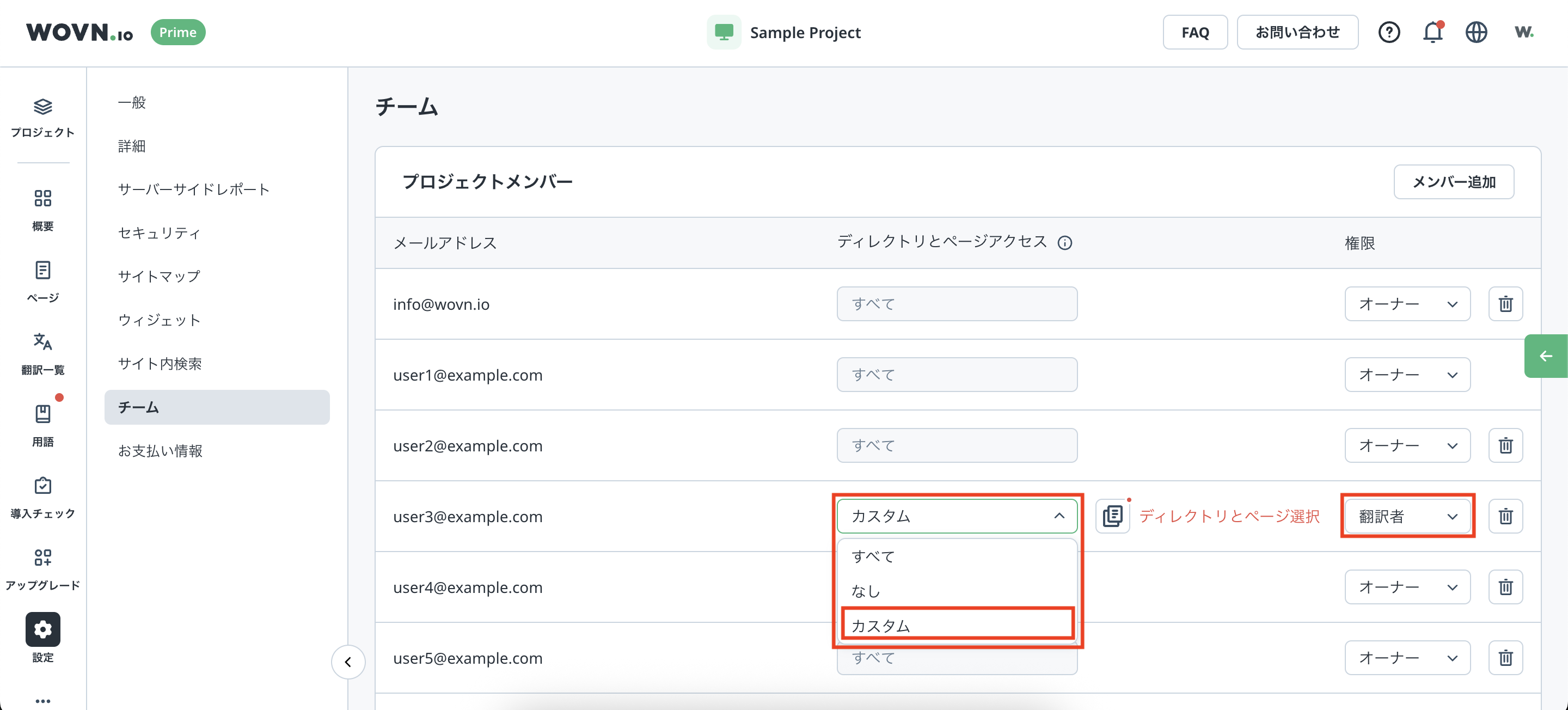 アクセス権限を設定したいユーザーの権限を「翻訳者」、ディレクトリとページアクセスを「カスタム」に設定します。