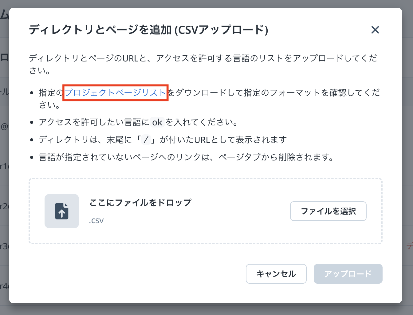 page_list English French https://example.com/page1 https://example.com/page2 https://example.com/page3 https://example.com/page4 ダウンロードした CSV を編集します。