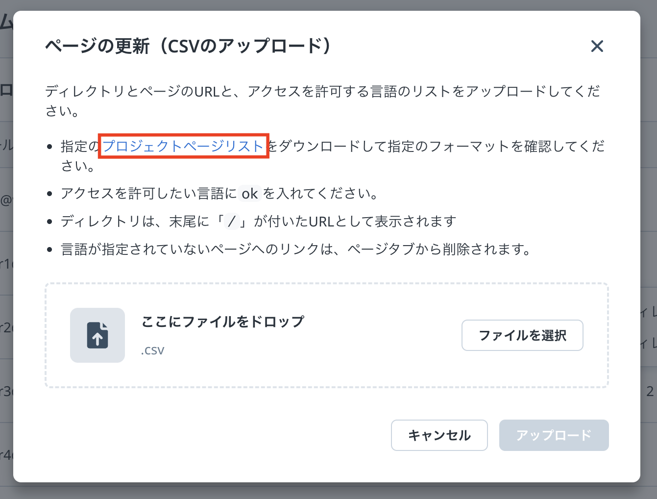 表示されるポップアップ画面内の「プロジェクトページリスト」のリンクを押下し、指定のフォーマットをダウンロードします。