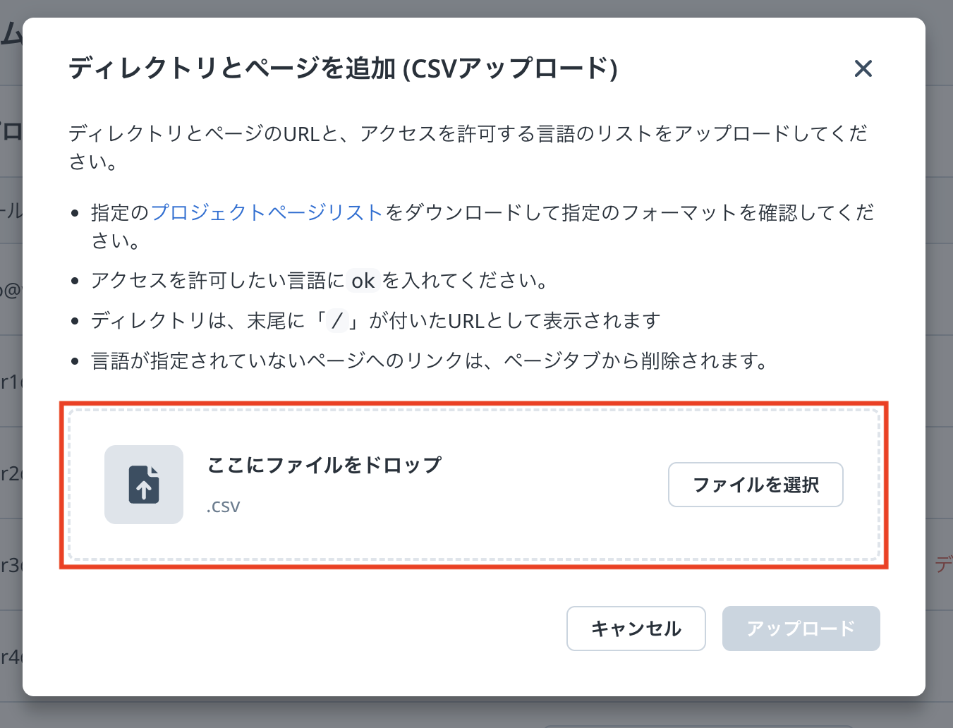 「ディレクトリとページを CSV で更新」を押下します。