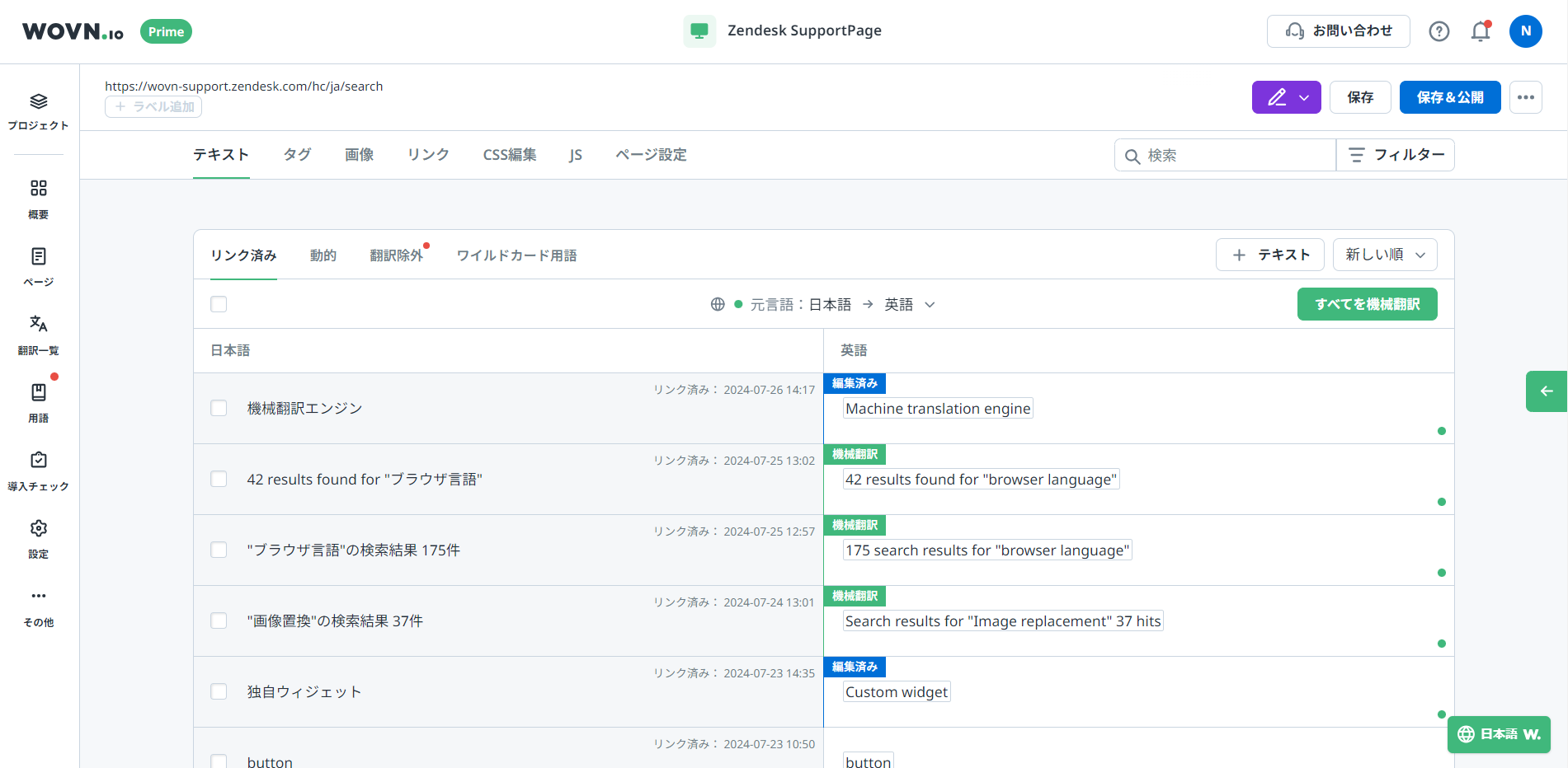 翻訳編集ページは、左に元言語、右に対訳が一覧表示される翻訳エディターです。WOVN 管理画面から対象のページを開くと、翻訳編集ページに移動します。