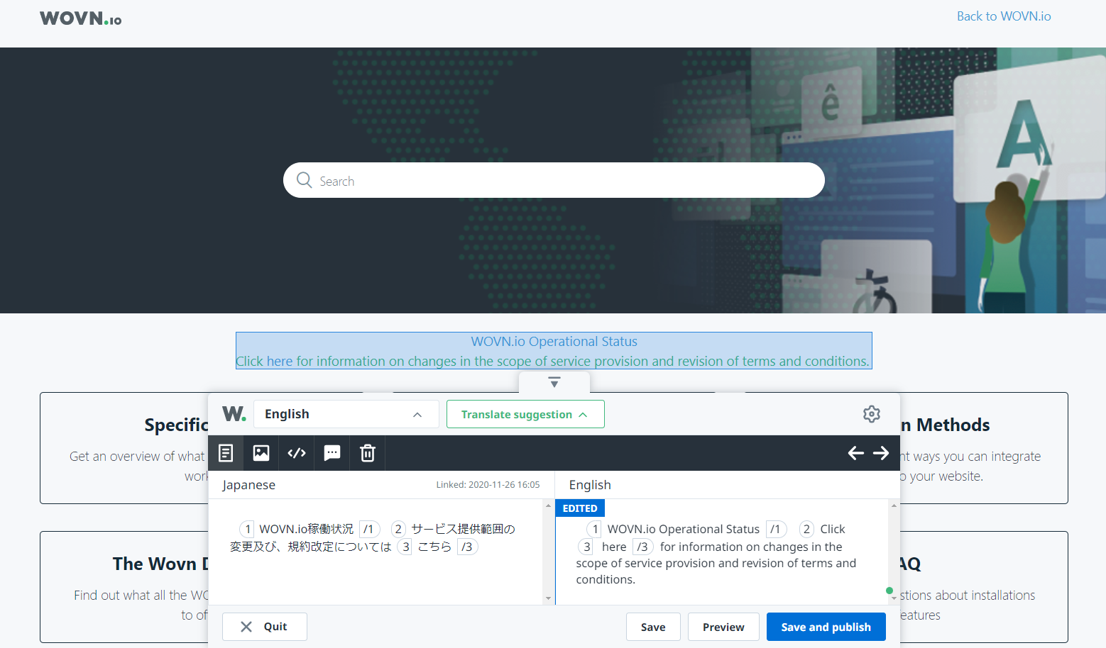 WOVN カスタマーサポートチームにご依頼いただくと、Web サイト翻訳の特徴を熟知した WOVN ローカライズチームが、テキスト翻訳だけでなく、ページごとのレイアウトや文脈を考慮した翻訳を提供します。WOVN 管理画面で翻訳の適用までを一貫して行うことも可能です。