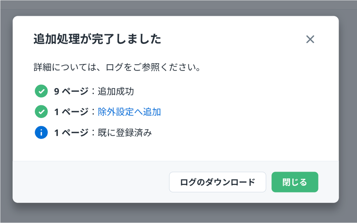 「ログのダウンロード」をクリックすると追加成功したページやすでに登録済みのページ、除外設定へ追加されたページ、追加エラーになったページのURLが記載された txt ファイルがダウンロードされます。