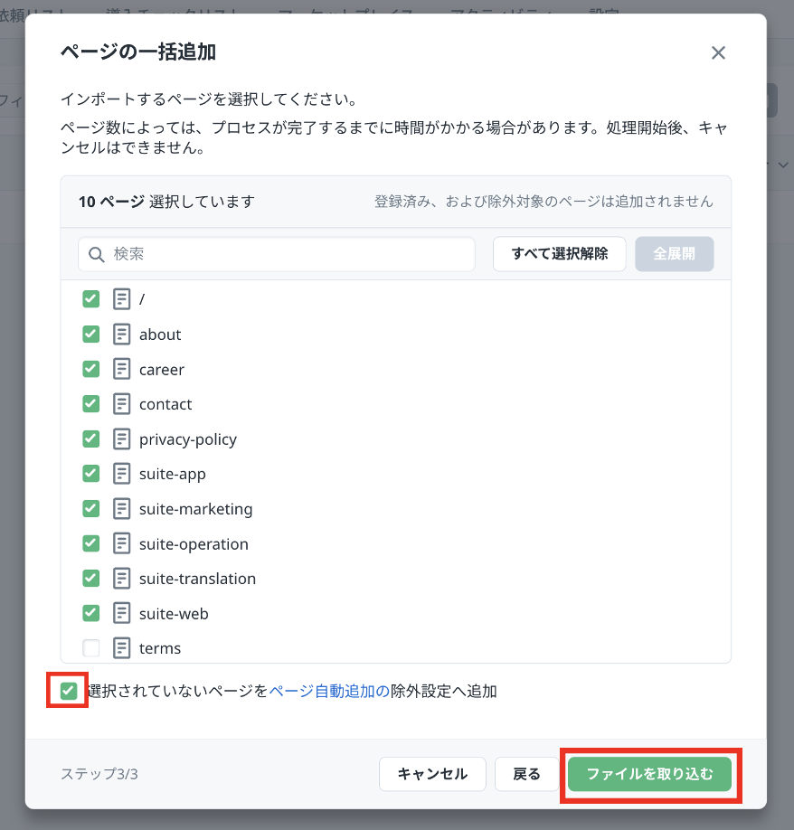 ページを除外設定したい場合は、除外したいページのチェックマークを外し、「選択されていないページをページ自動追加の除外設定へ追加」にチェックを入れます。