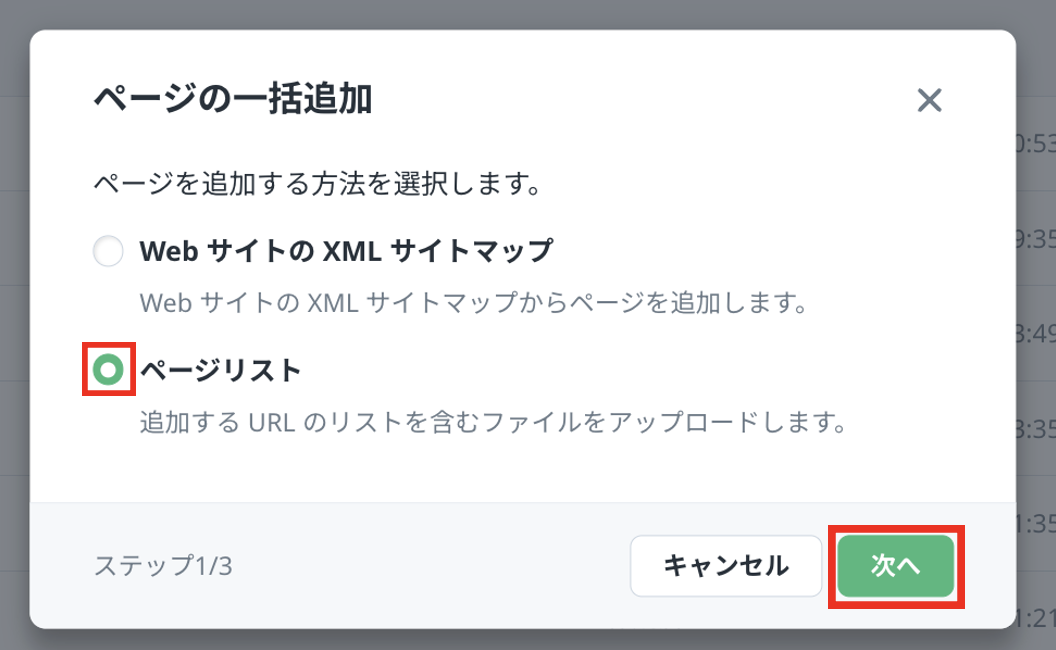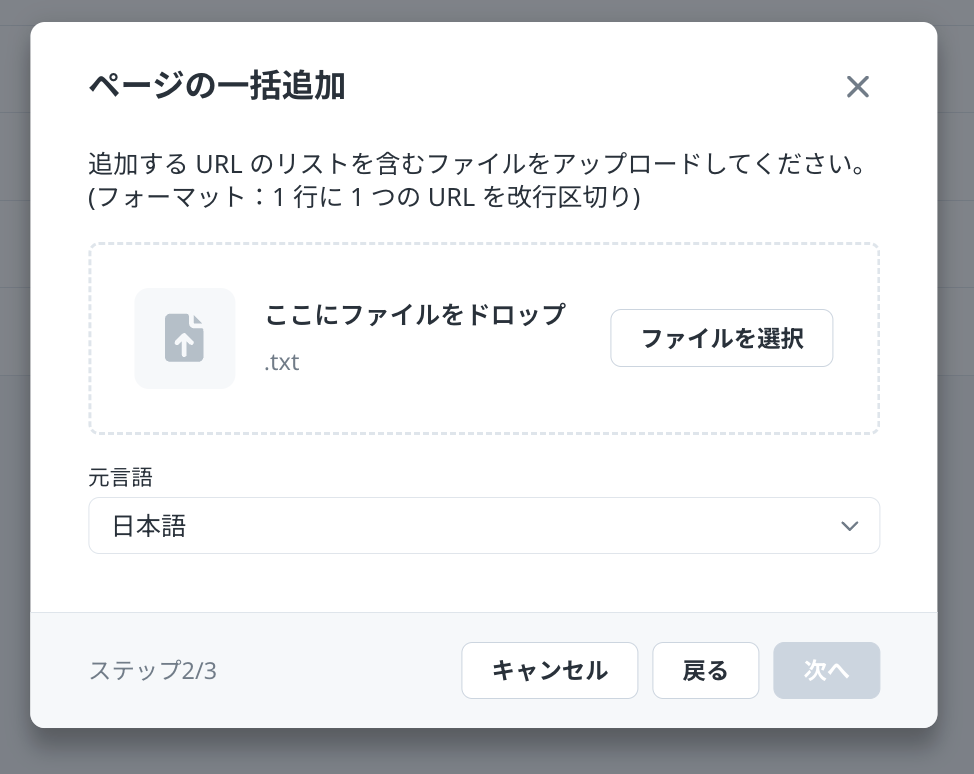 WOVN にページを一括で登録したい場合、WOVN 管理画面の「ページ」タブを開き、右上「+ページの一括追加」にて Web サイトのサイトマップ XML もしくは txt ファイルにより登録ができます。