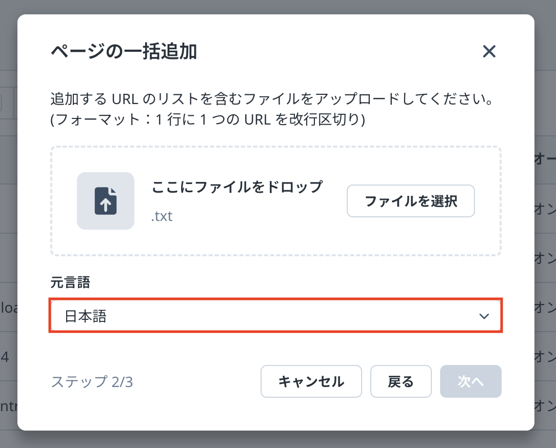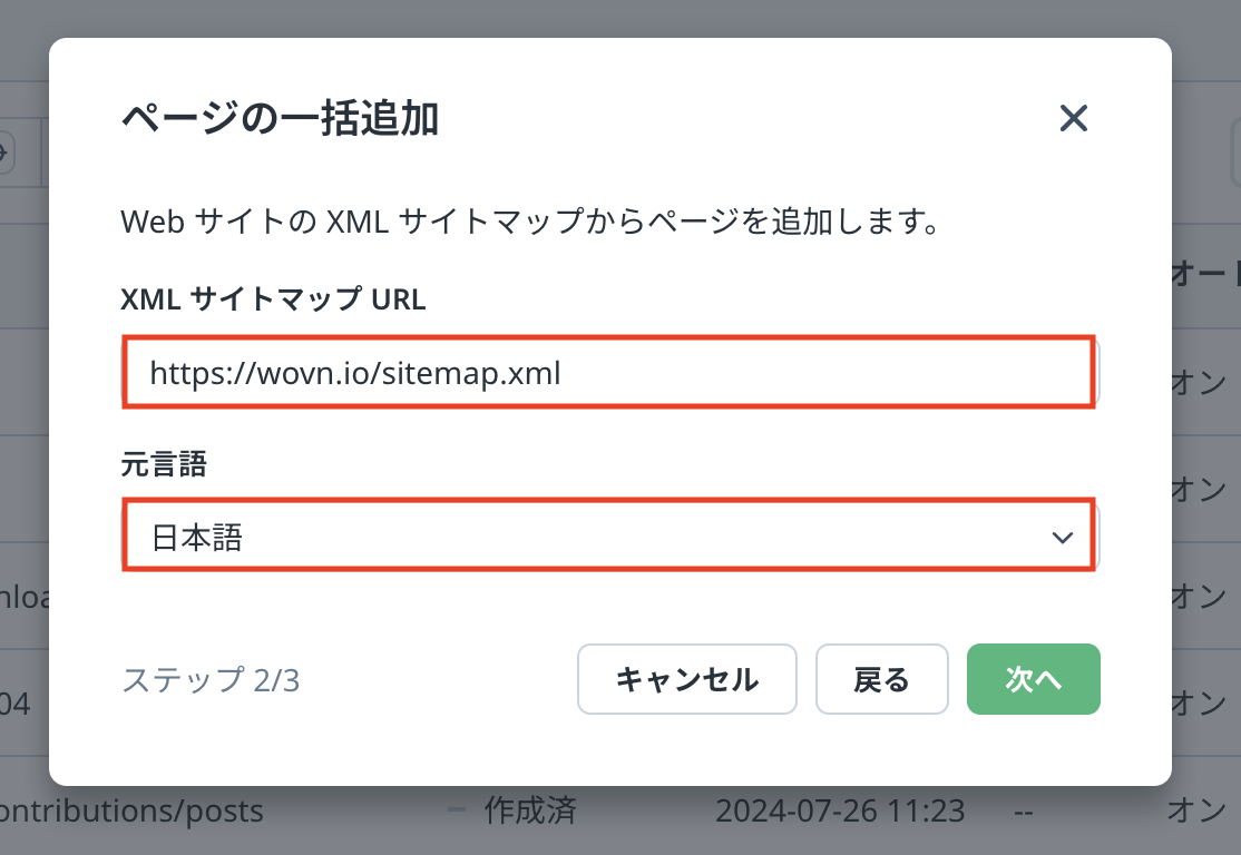 「XML サイトマップ URL」を入力し、元言語を選択後、「次へ」をクリックします。