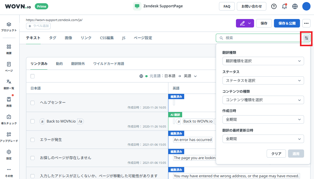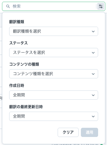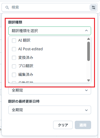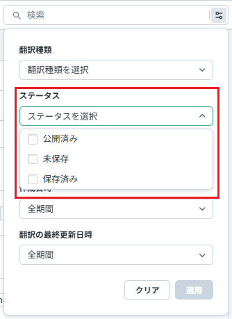 翻訳が保存されているのか、公開されているのか、等のステータスでフィルタリングできます。