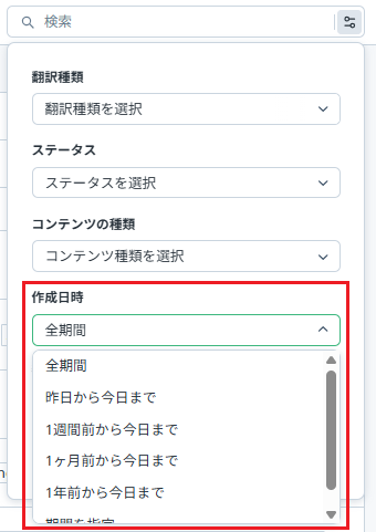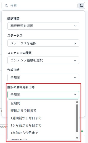 プリセットから選べる期間または任意の期間を指定して、バリューが最後に翻訳された日付を基準に絞り込みを行います。