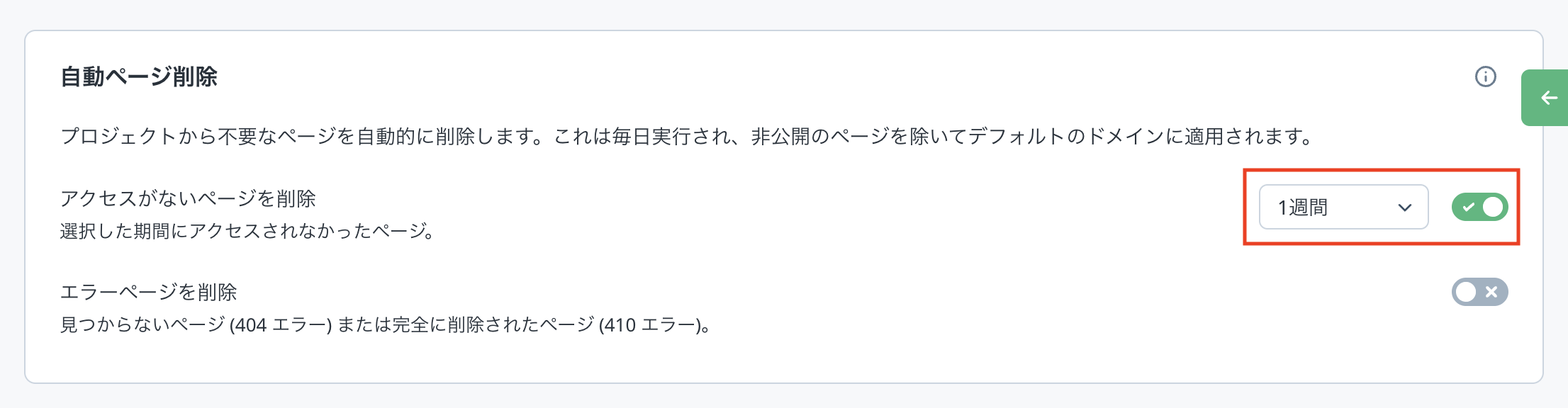 毎日 AM 1:00 (日本時間) に削除処理が実行されます。 - 期間測定の起点は、「自動ページ削除」機能を有効にしたタイミングではありません。