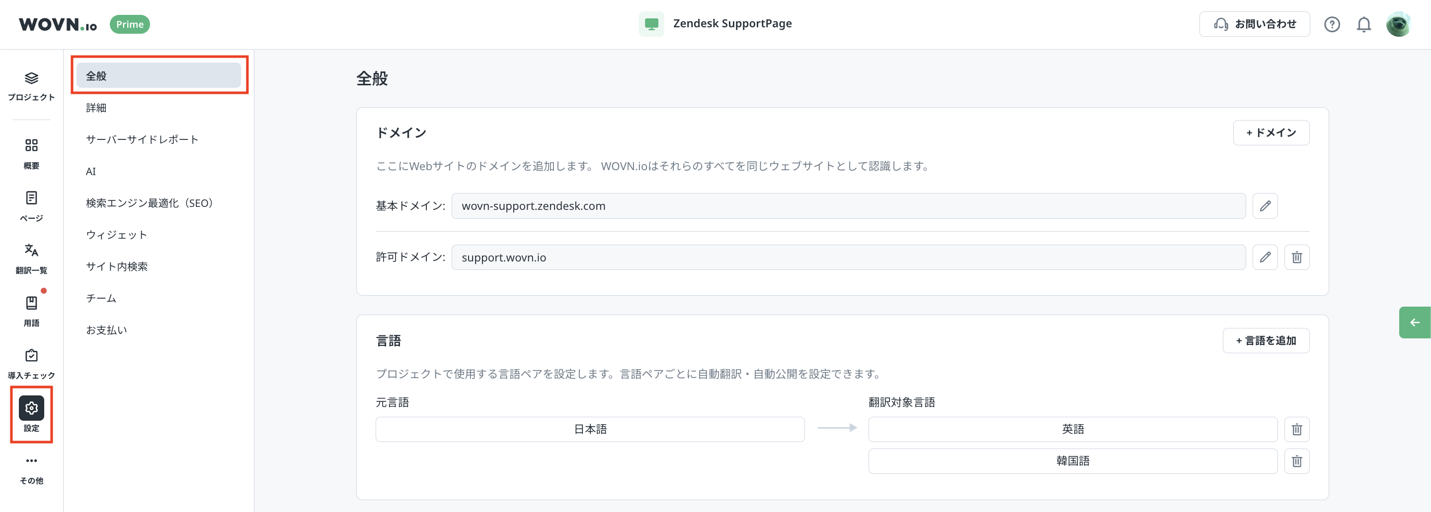 ドメインの設定は、WOVN 管理画面左側メニュー「設定」→「全般」から行います。