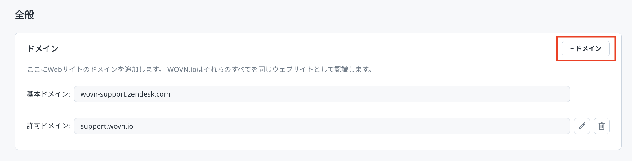 WOVN 設定画面、「全般」→「ドメイン」項目で、「+ドメイン」ボタンを押下します。