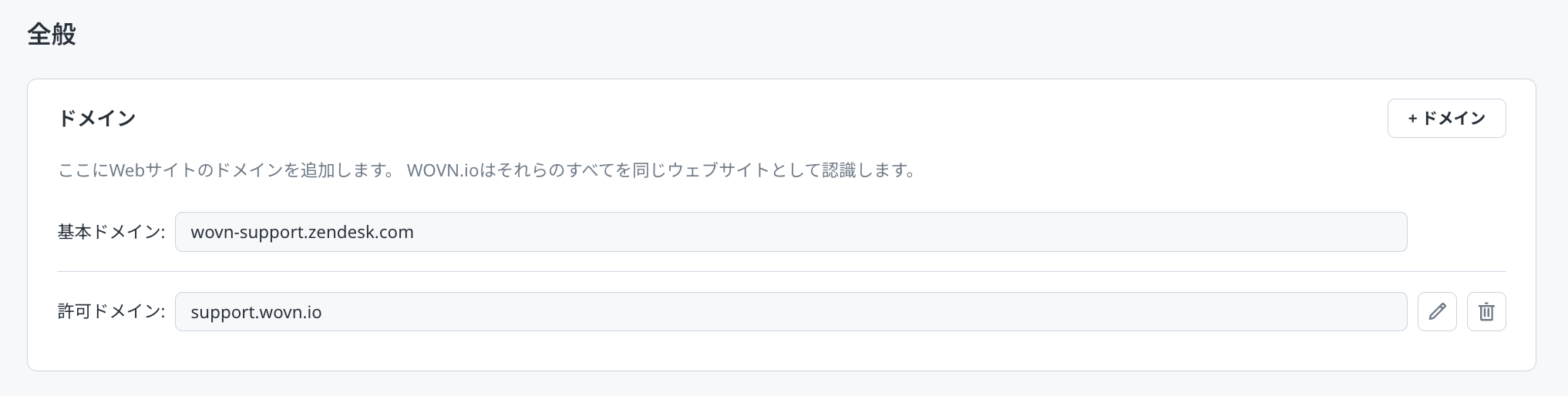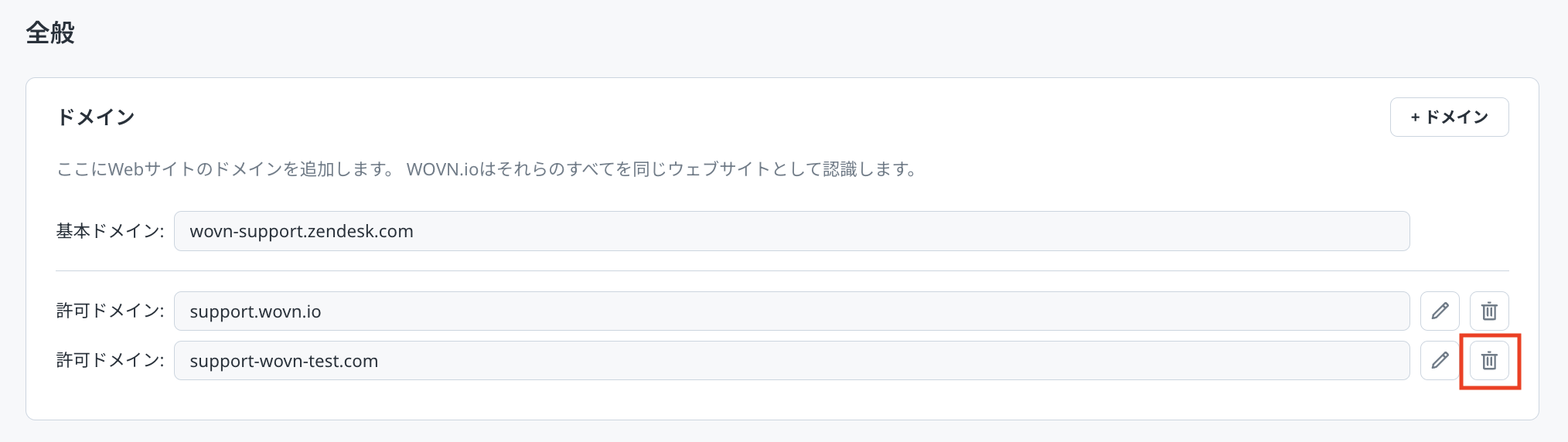 WOVN 設定画面、「全般」→「ドメイン」項目で、削除したいドメインの右側にあるゴミ箱のアイコンを押下します。