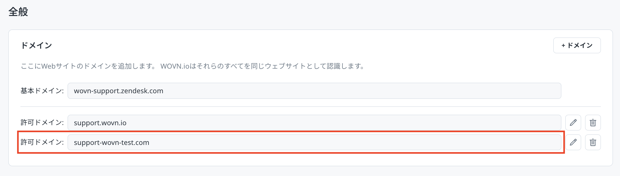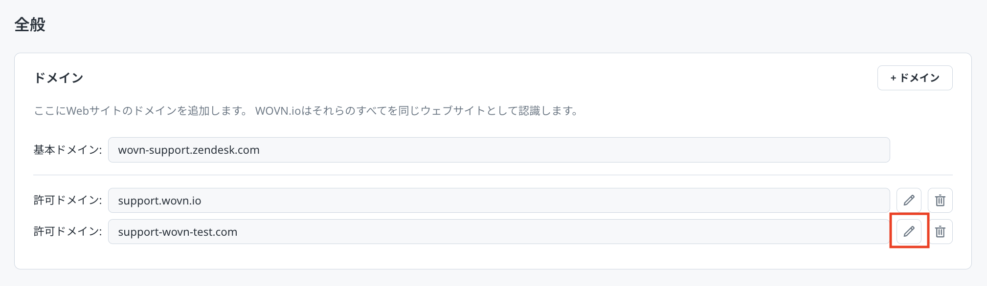 WOVN 設定画面、「全般」→「ドメイン」項目で、編集したいドメインの右側にあるペンのアイコンをクリックします。