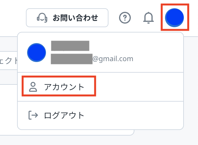 WOVN 管理画面右上の丸いアカウントアイコンを押下し、「アカウント」を押下します。