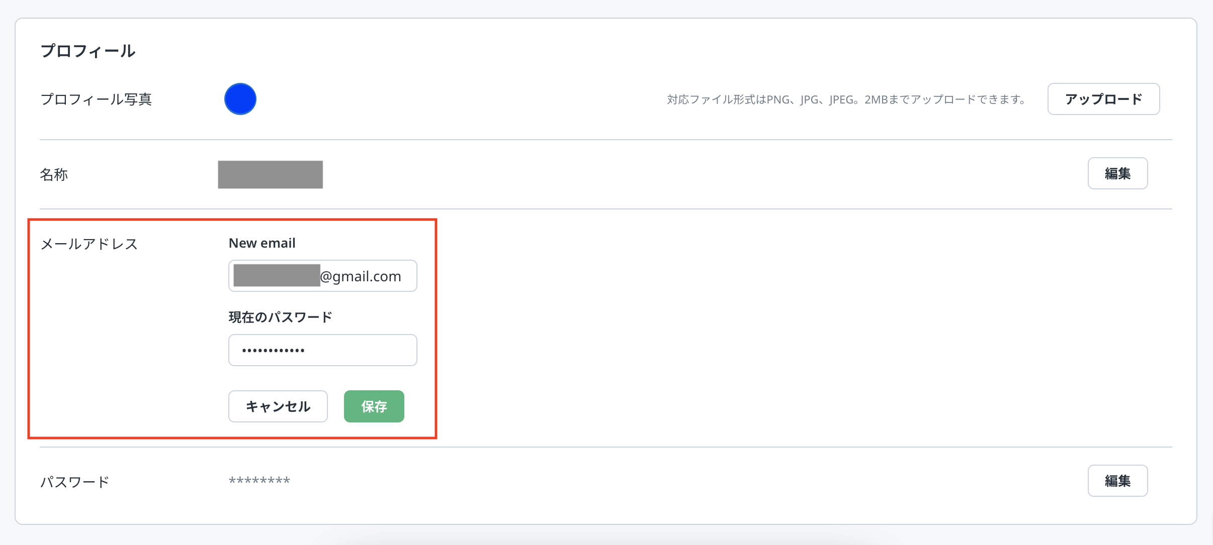 新しいメールアドレスと、現在使用しているパスワードを入力し、「保存」を押下します。