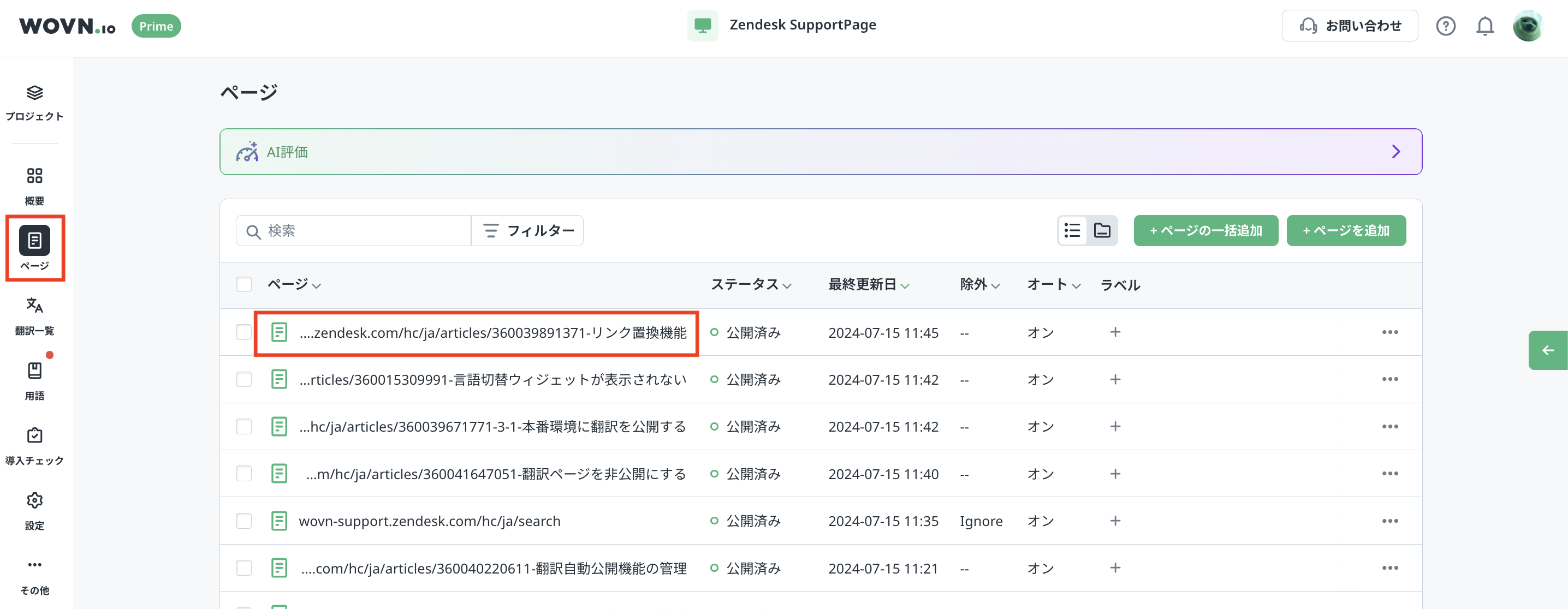 「すべてのページ」を選択すると、このプロジェクトで有効な全てのページにリンクの置換が適用されます。