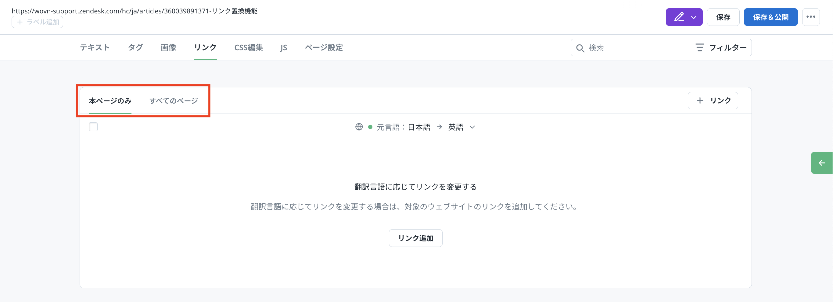 「本ページのみ」を選択すると、開いているページにのみリンクの置換が適用されます。