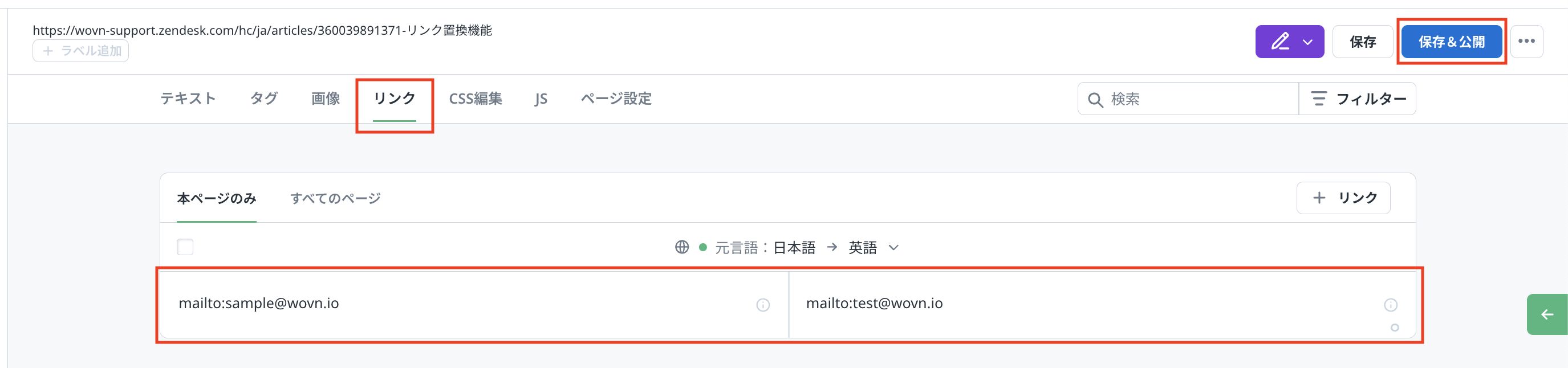 例)メールアドレスが の場合、mailto:test@wovn.io と入力します。