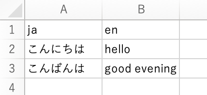 例:元言語(原文)が日本語の場合ja en zh-CHS こんにちは Hello 你好 こんばんは Good evening 晚上好 1 行目に設定する各言語の言語コード(言語地域コードを参照)を入力します。 1 列目に元言語の言語コードを、2 列目以降に翻訳言語の言語コードを入力します。 2行目以降に登録する用語と翻訳言語ごとの対訳を入力します。 以下の形式で保存します。