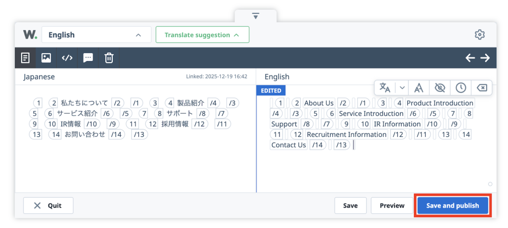 6. 「Save and publish」ボタンを押下し、修正結果をサイトに反映します。