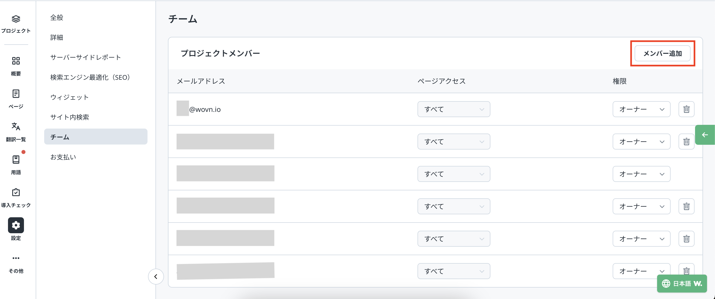 WOVN 管理画面、左側メニュー「設定」→「チーム」メニューで、「メンバー追加」ボタンを押下します。