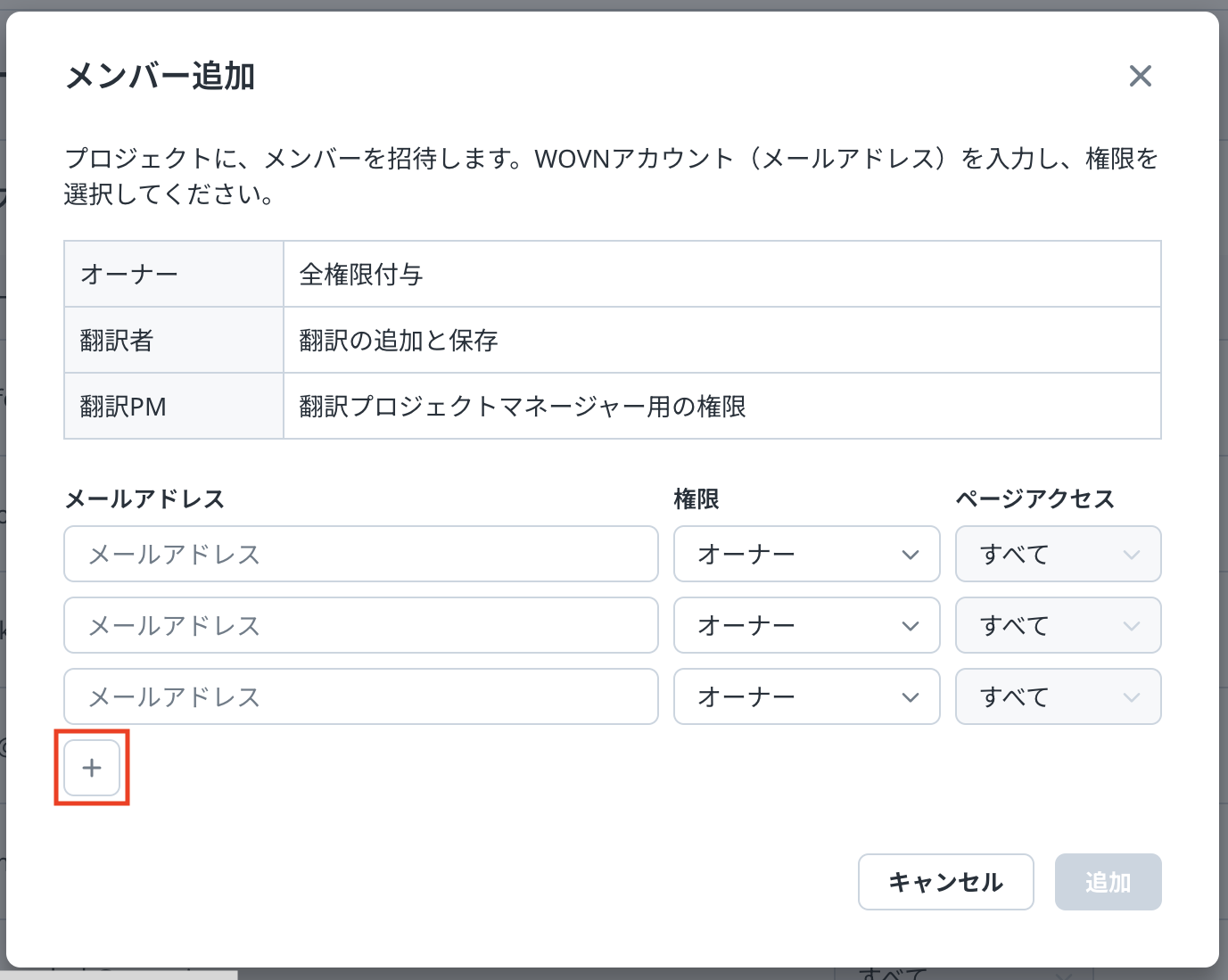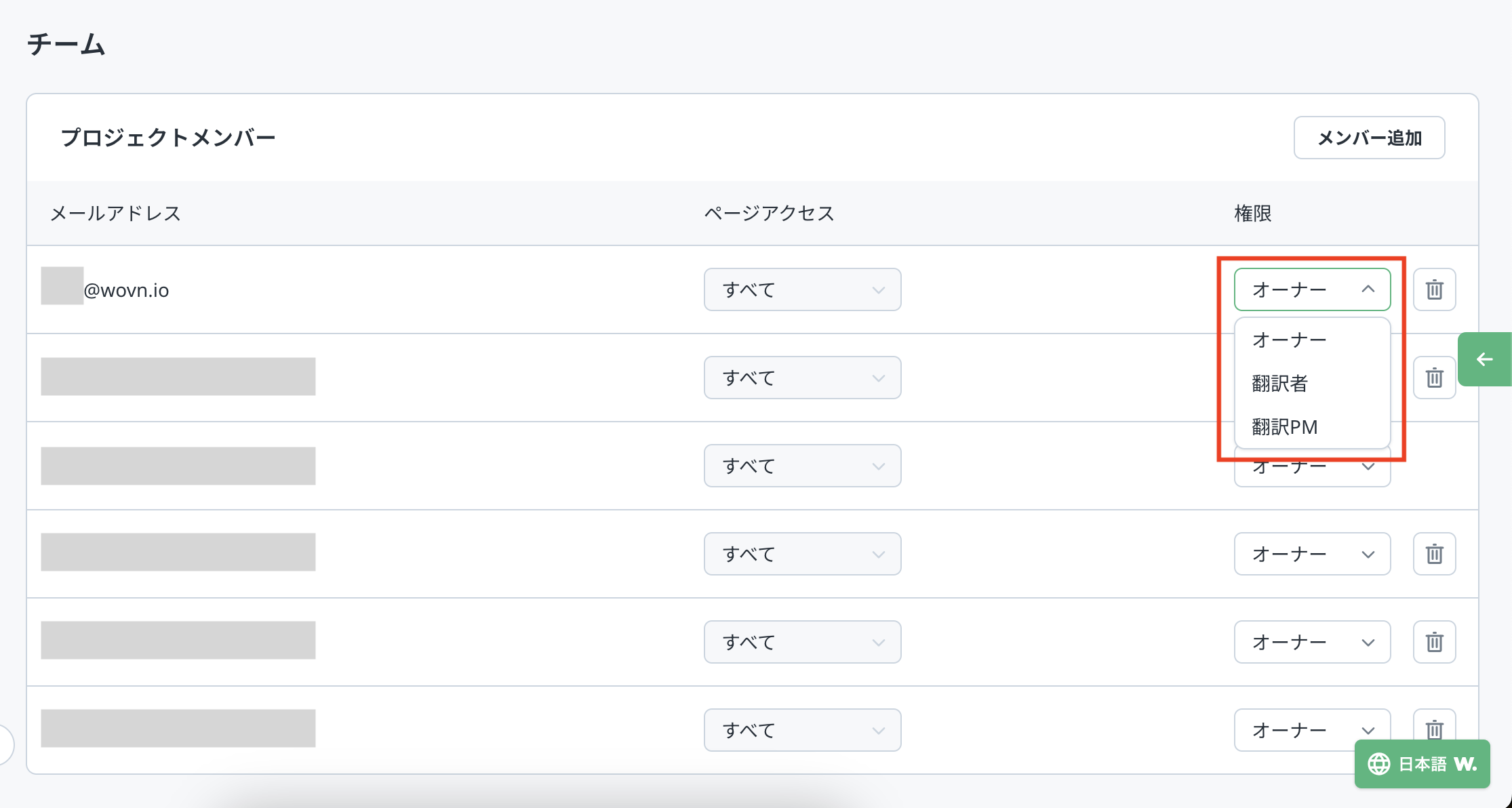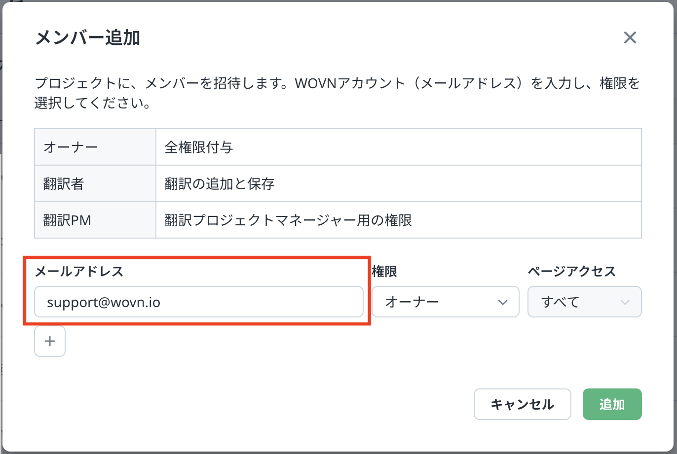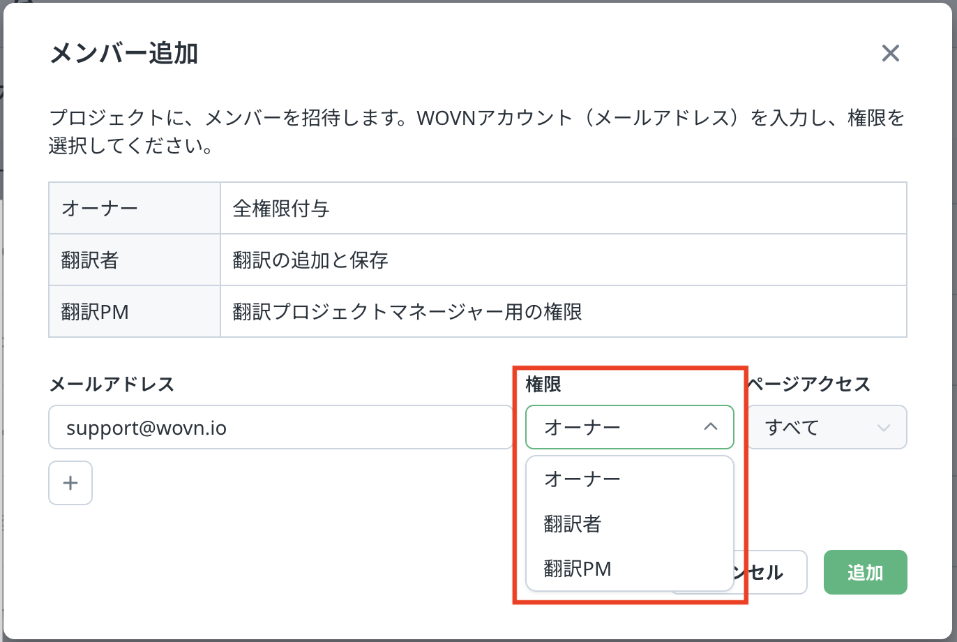 権限を「オーナー」「翻訳者」「翻訳PM」のいずれかに設定します。