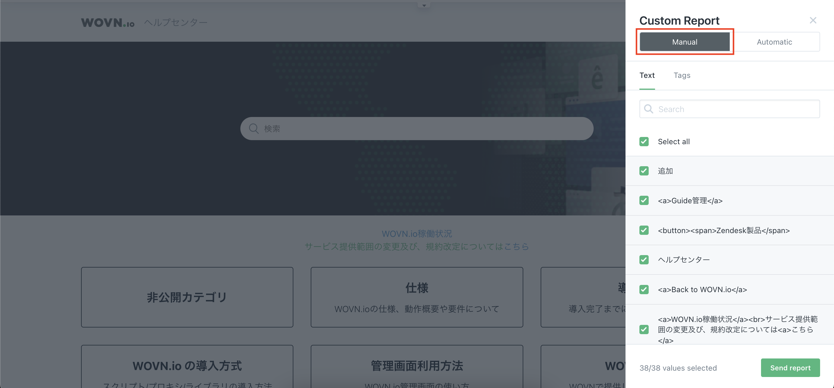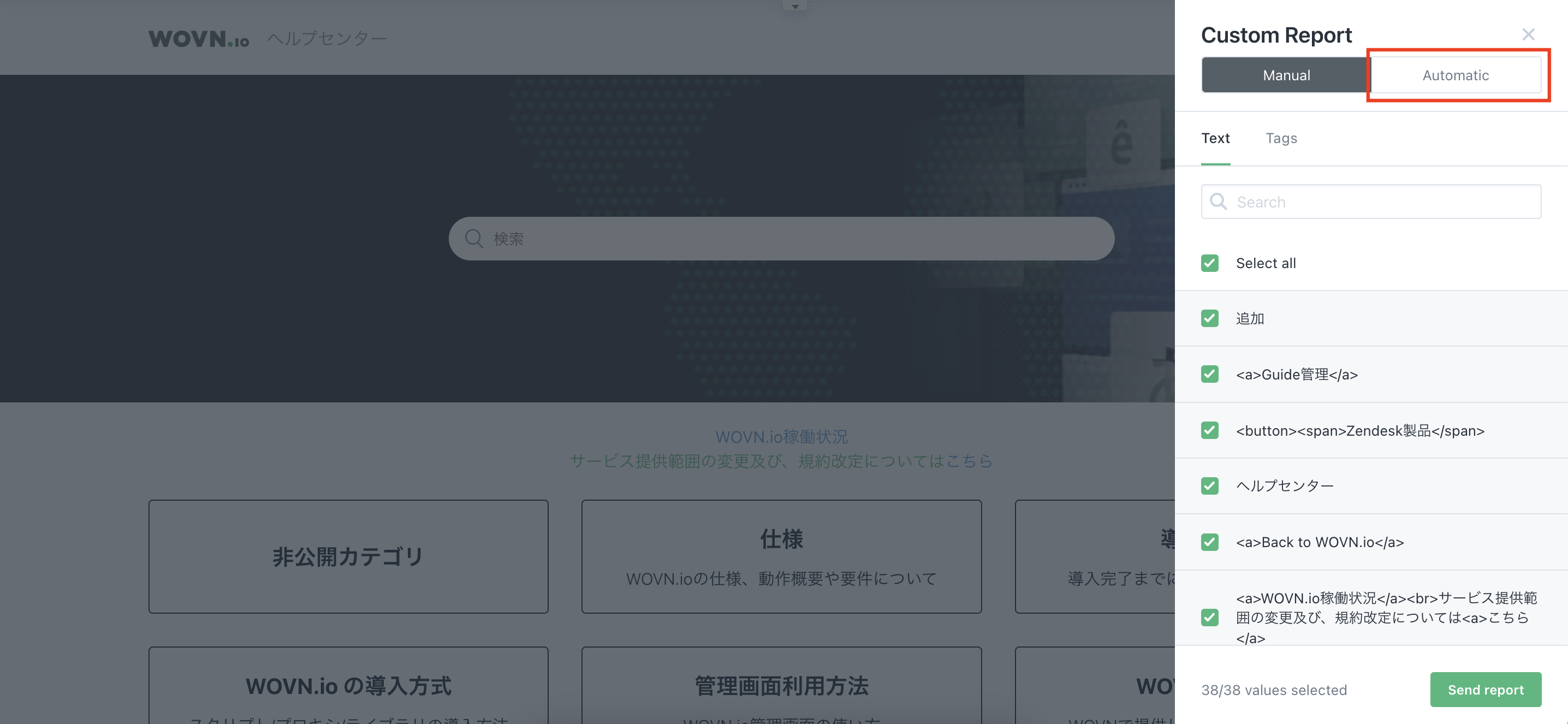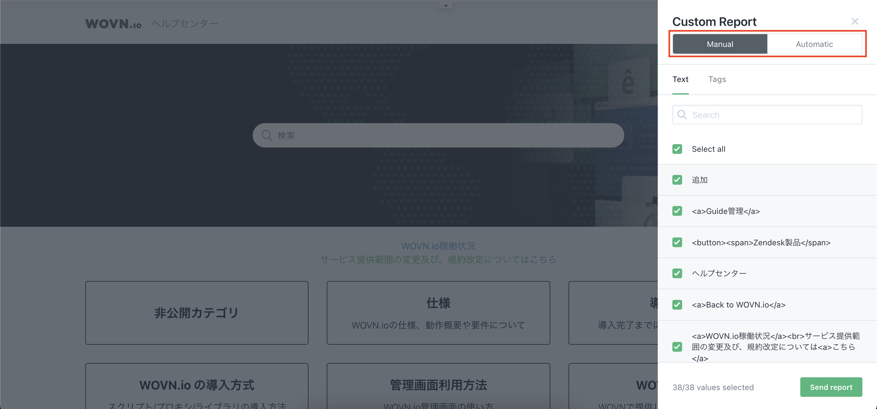 「Custom Report」ウィジェットをクリックすると、現在 Web ページ上に表示されているコンテンツが WOVN に取り込まれます。