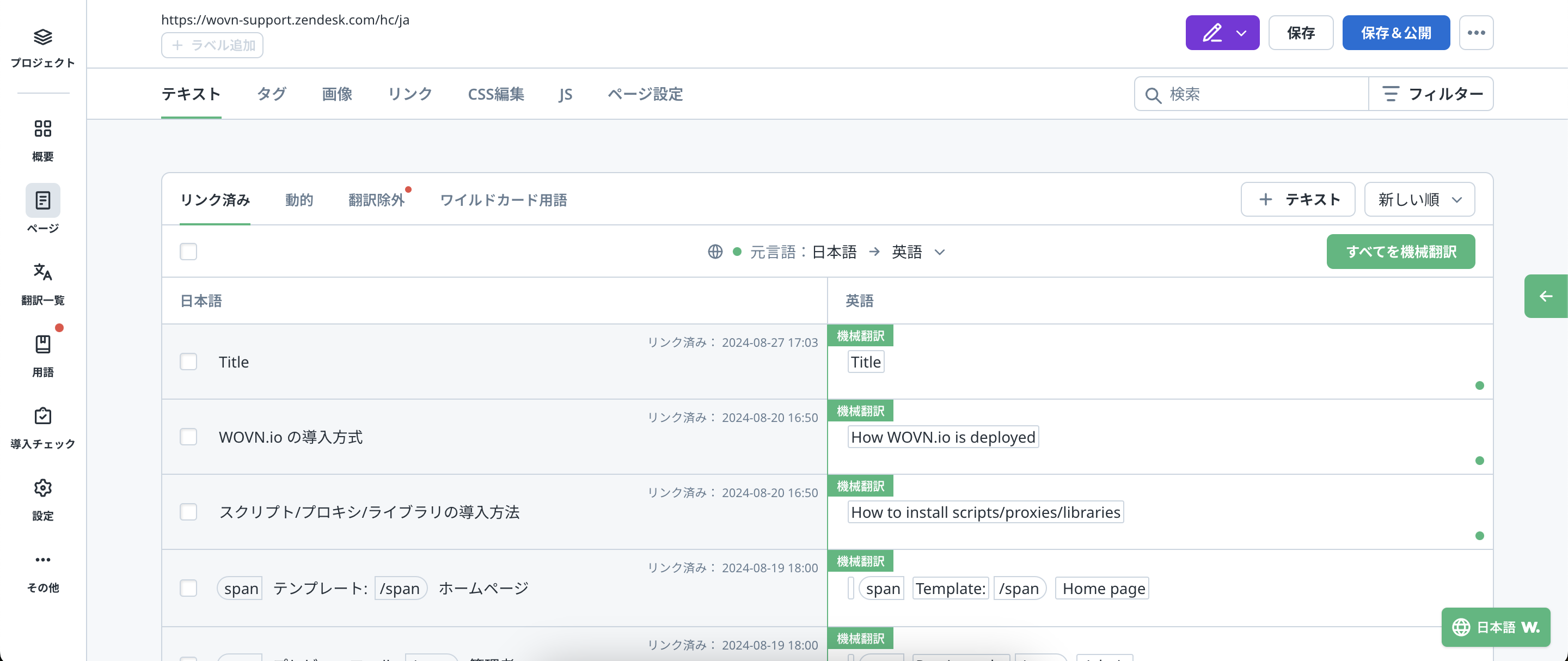 4. 翻訳編集ページ で、テキストが取り込まれているかどうか確認します。
