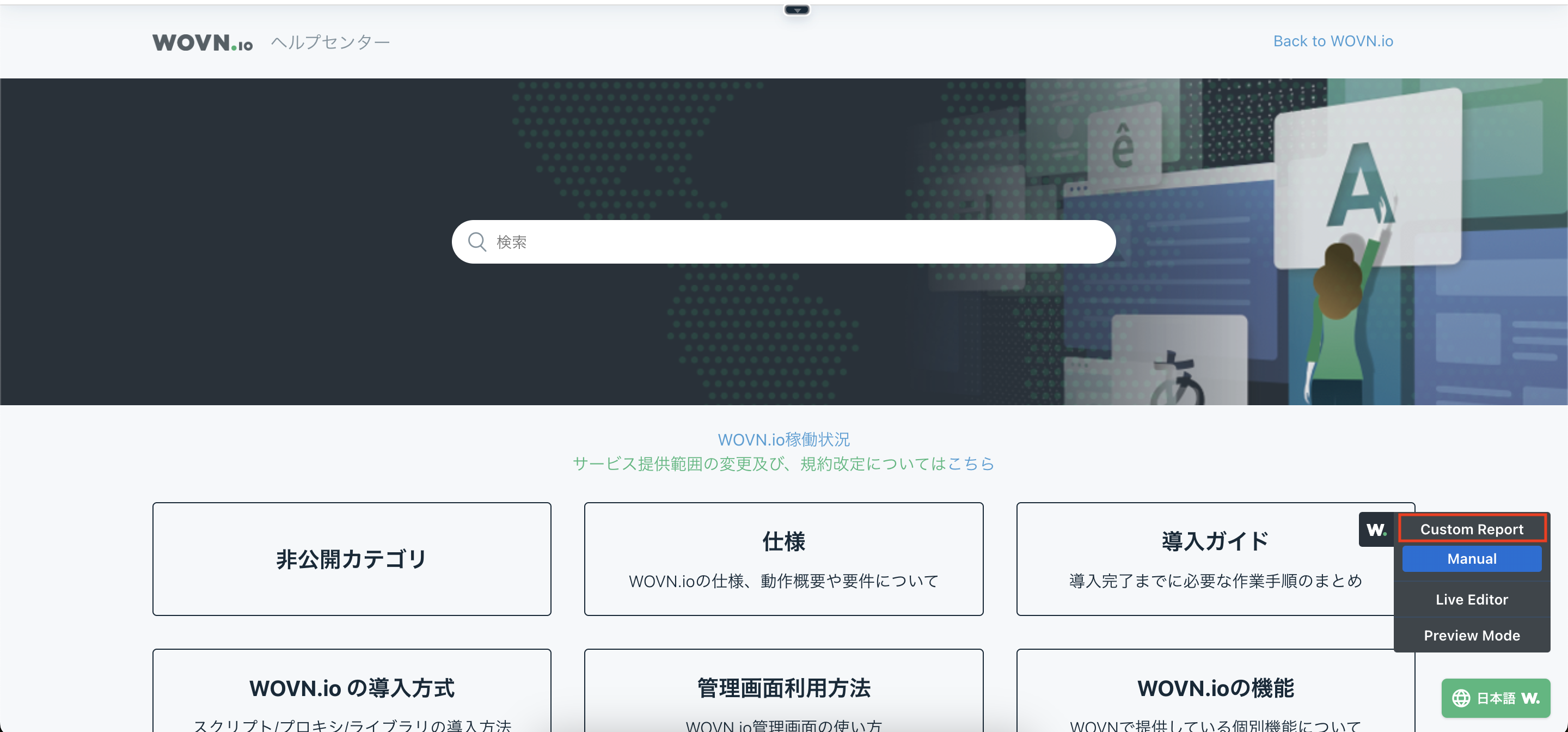 - WOVN 管理画面へログインした状態で Web サイトを閲覧すると、画面右下に「Custom Report」ウィジェットが表示されます。
