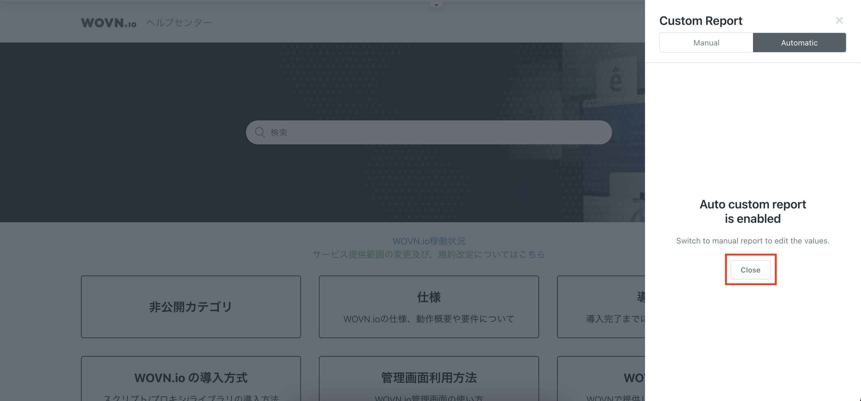 管理画面へログインしているにもかかわらず「Custom Report」ウィジェットが表示されない場合は、対象のアカウントとプロジェクト名を添えて、WOVN 管理画面右上の「お問い合わせ」ボタンからお問い合わせください。