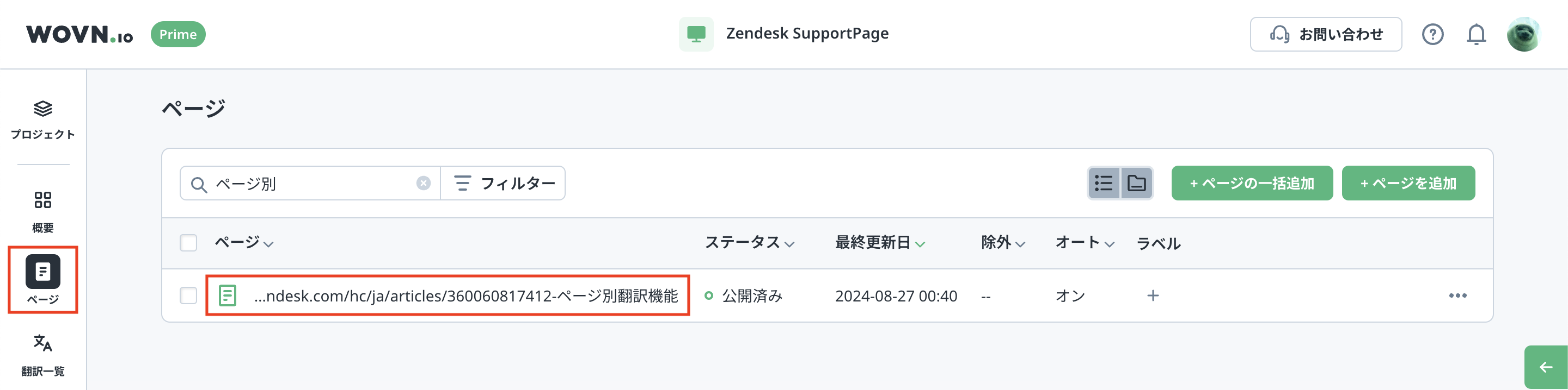 管理画面左側メニュー「ページ」から、対象ページの翻訳編集ページへ移動します。