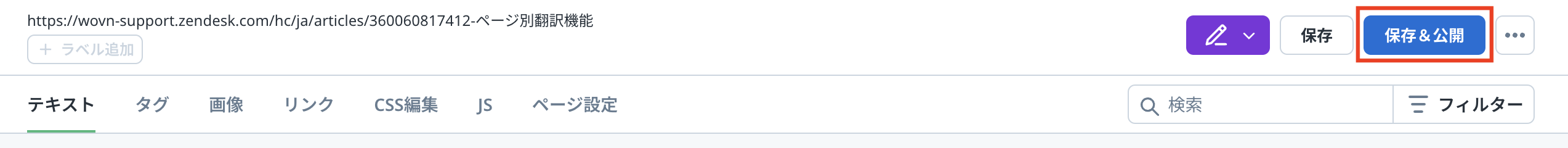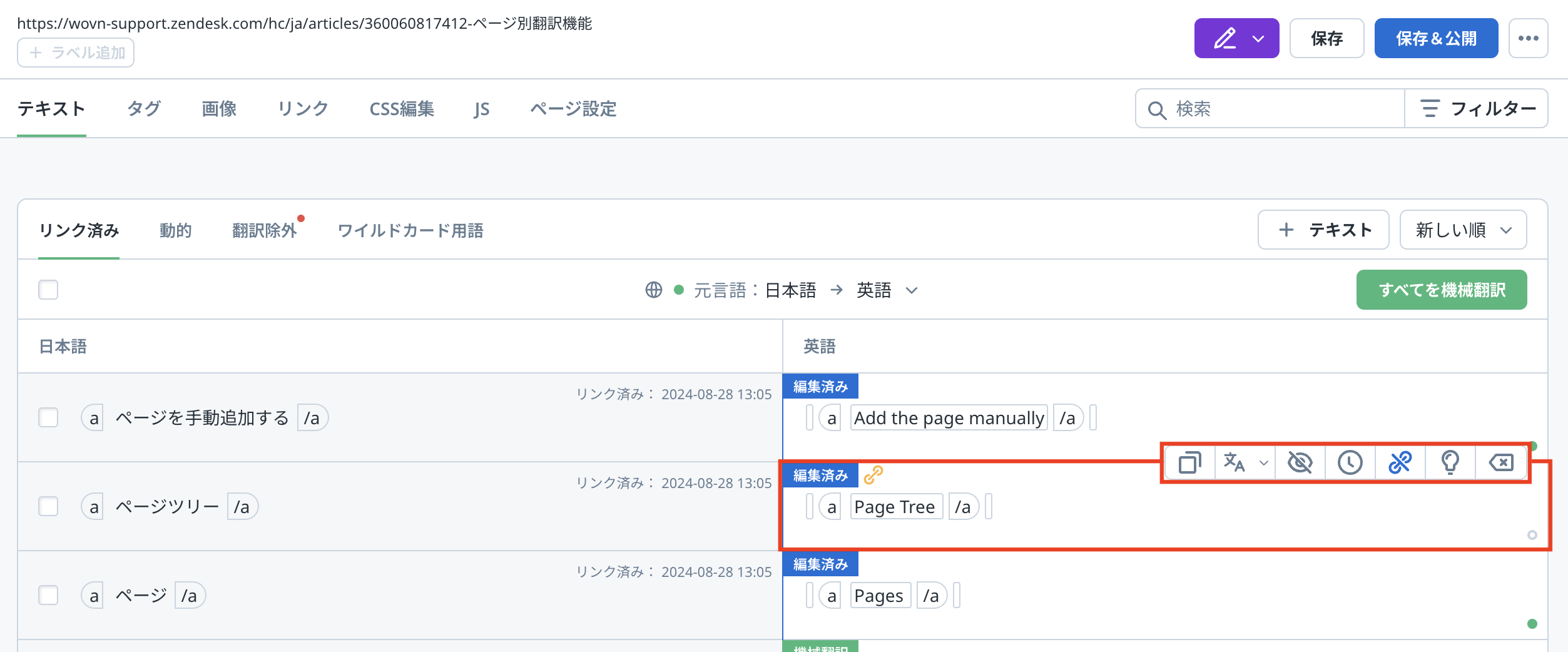 翻訳結果を公開する場合は「保存&公開」ボタンを、公開せずに保存する場合は「保存」ボタンを押下します。