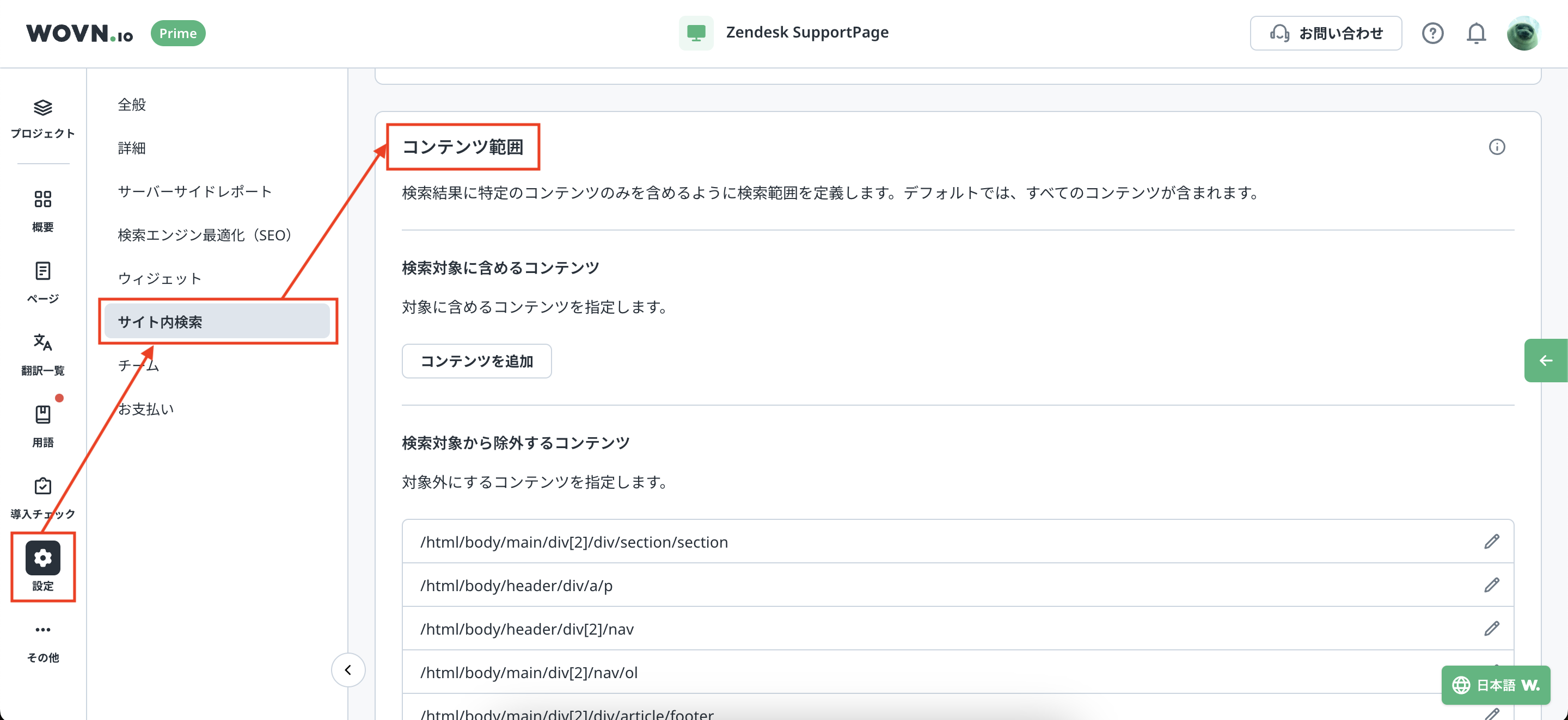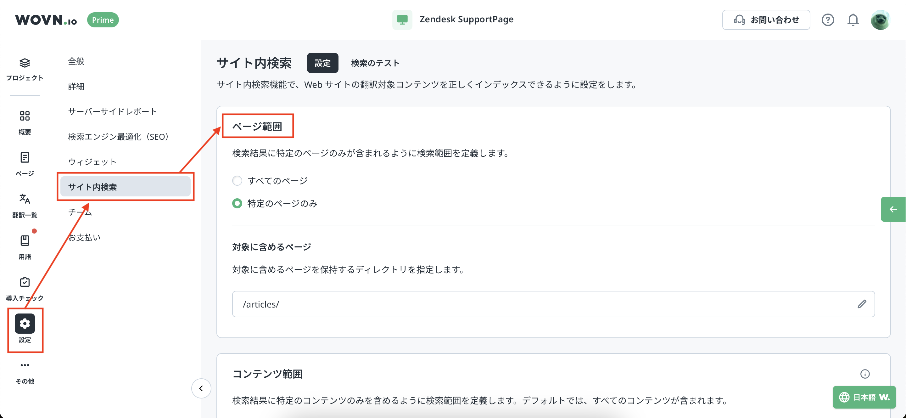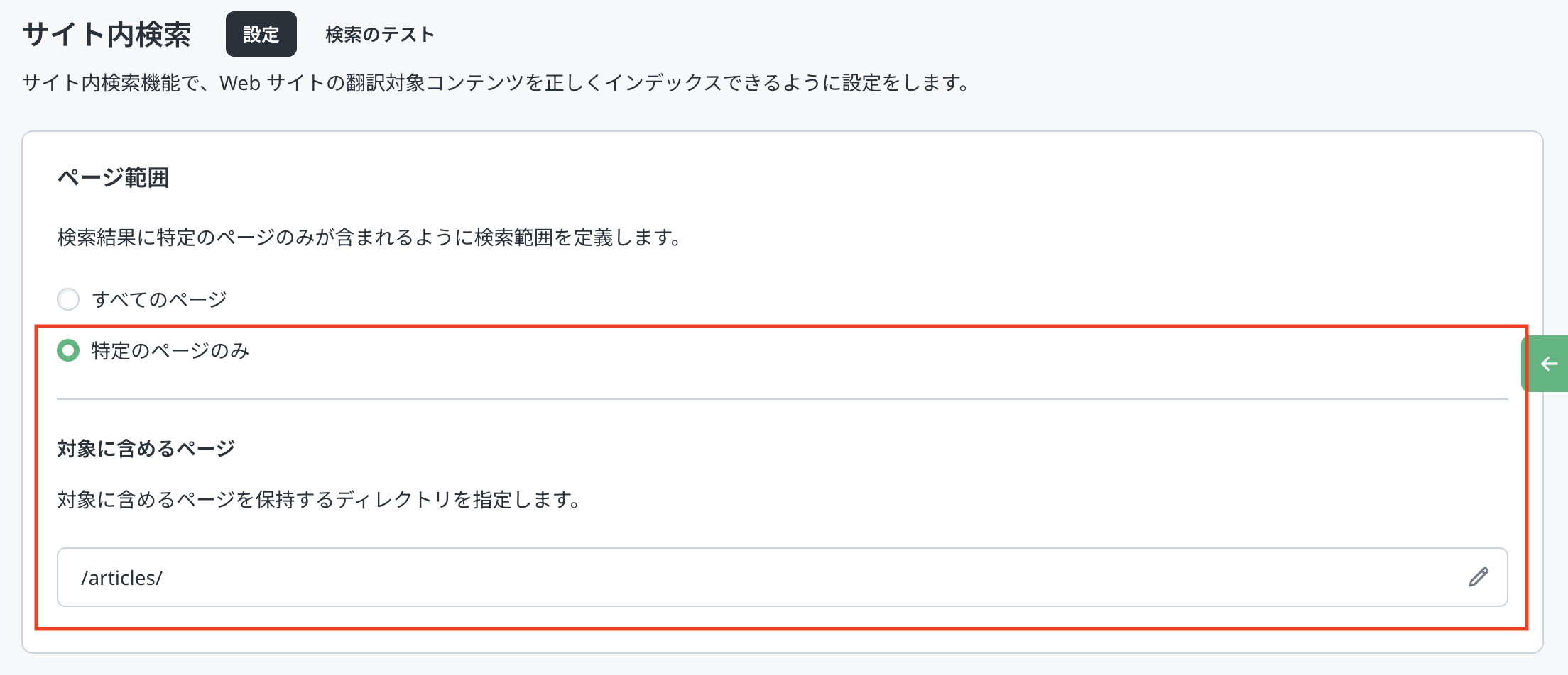 WOVN.io で翻訳しているページのうち、一部のページのみが検索対象の場合は、「対象ページの指定」指定を行ってください。