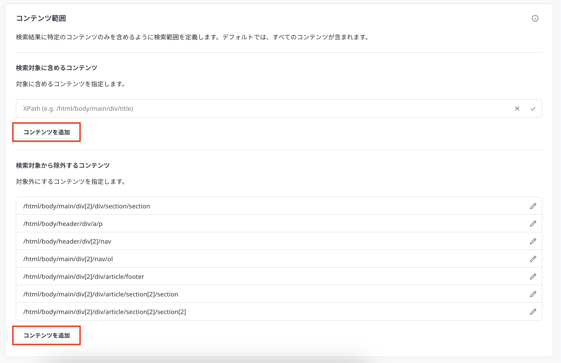 検索対象に含めるコンテンツと含めないコンテンツ、それぞれを「コンテンツを追加」ボタンを押下して設定します。