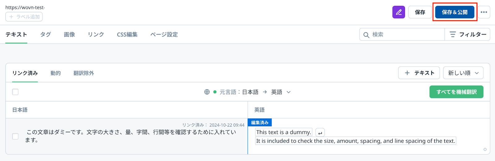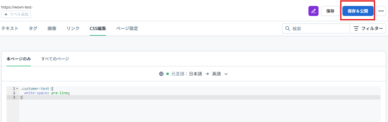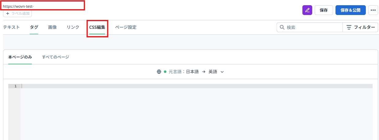 - 「翻訳編集ページ」を開き、上部の「CSS編集」タブを押下します。
