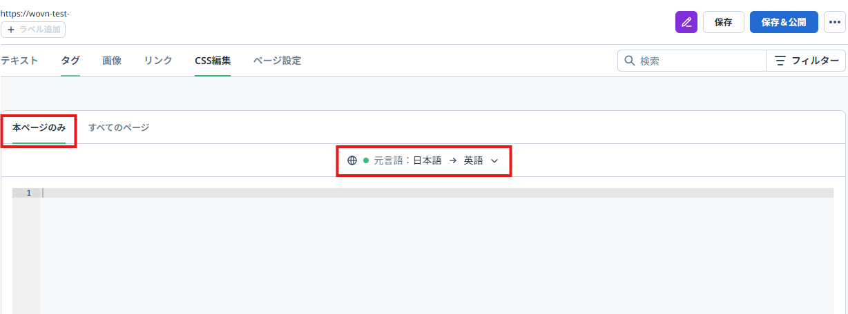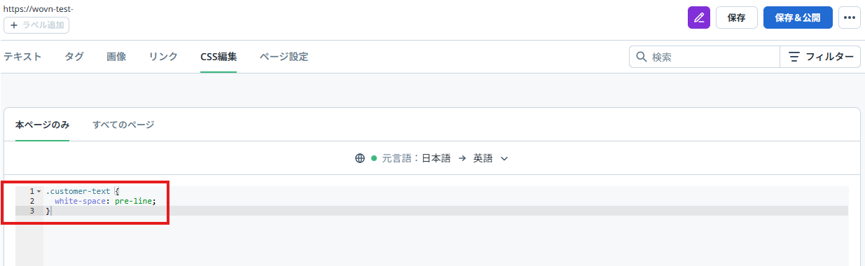 - 「本ページのみ」タブを押下し、改行を挿入する対象言語を設定します。(対象ページ・対象言語にのみ、CSS の記述が適用されます)