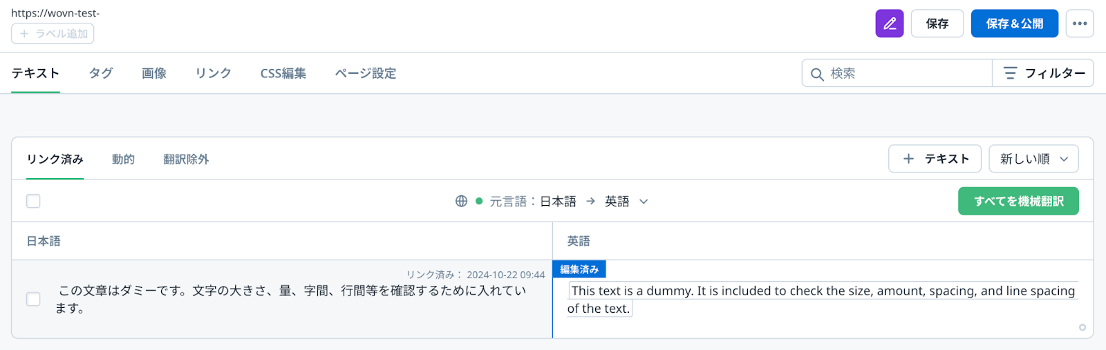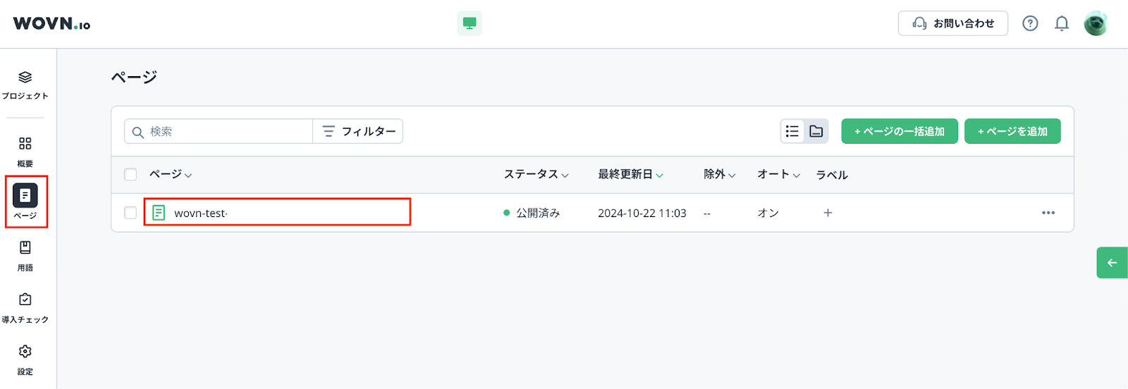 - WOVN 管理画面、左側メニュー「ページ」で、対象のページを検索し、URL を押下します。