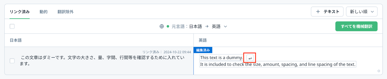 - 改行を入れたい翻訳後のテキスト内で、Shift+Enter キーを押下します。下図のように、「↵」アイコンが挿入されます。