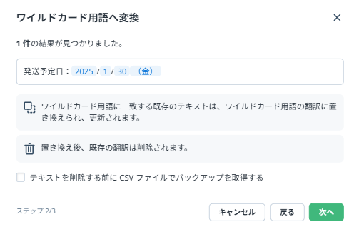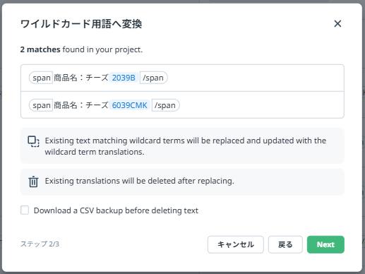 登録を進めると、完全一致したテキスト(バリュー)はすべてワイルドカード用語に置き換えられます。なお、機械翻訳文字数は消費されません。