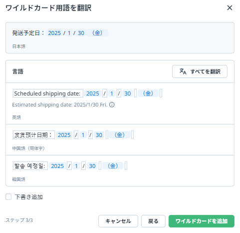 例:用語集に「(金)」を登録した上で、「発送予定日:2025/1/30 (金)」をワイルドカード用語として登録する