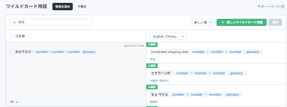 - ワイルドカード用語追加後は、WOVN管理画面左側メニュー「用語集」→「ワイルドカード用語」→「有効化済み」のタブで、登録したワイルドカード用語を確認できます。
